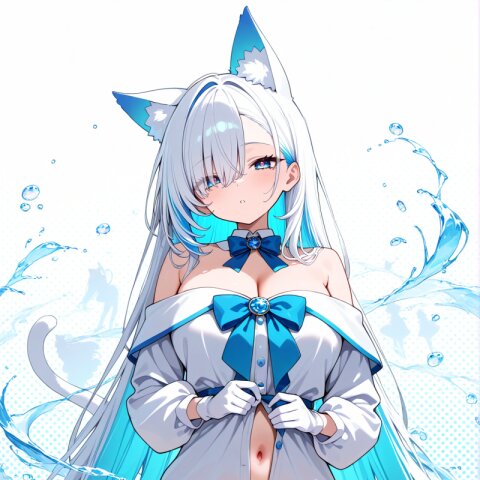 Anime illustration, bouncing, dressing up, wearing, colorful hair, no one around, pure white wind pattern background, pure white, full body, silhouette, slim, white hair, no one around, one girl, colorful long hair, long bangs, asymmetrical bangs 0.9, red raised, shirt, long sleeves, white cat ears, big eyes, blue eyes, red pupils, slanted eyes, clear eyes, irises, long eye corners, dignified eyes, shading the gradient of the eyes, dots under the eyes, fine-grained woven outdoor small toes small size, white gloves, blue bow tie, light green bow tie, off-shoulder, slightly large breasts, slim, glamorous, attractive body, showing cleavage, exposing navel, D cup, height 124 cm, expectations, 4.5 heads, water magician, water magic bubbles engulf the character, water magic bubbles surround the front and back, 4K,