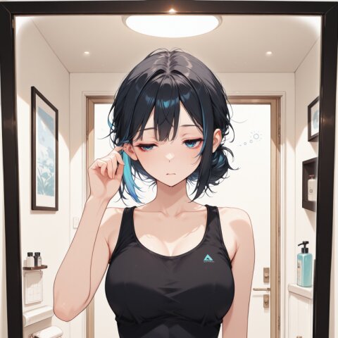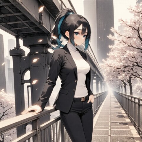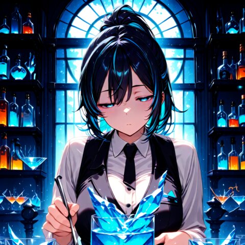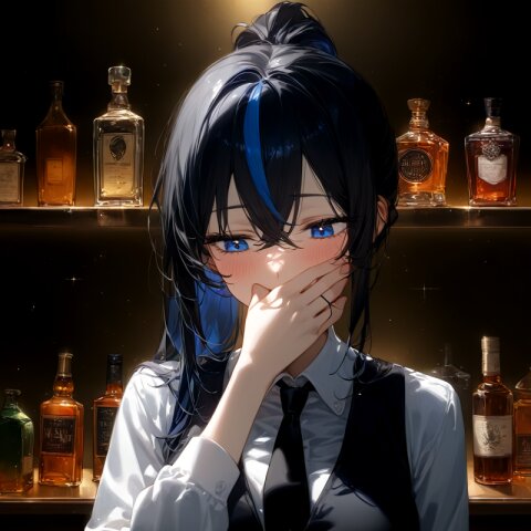 (masterpiece, best quality, high quality, high resolution:1.2), (professional female bartender:1.4), 1girl, adult woman, 27 years old, ((black hair in ponytail:1.3)), ((blue highlights in hair:1.2)), ((tired expression:1.3)), ((expressionless:1.2)), ((half-closed eyes:1.3)), ((sleepy eyes:1.2)), ((sharp eyes:1.2)), ((narrow eyes:1.2)), ((drooping mouth corners:1.2)), slim tall body, ((professional bartender uniform:1.3)), ((bartender vest:1.2)), ((elegant bow tie:1.2)), ((white dress shirt:1.2)), mixing drinks, behind bar counter, holding cocktail shaker, atmospheric bar lighting, crystal glasses, premium bottles, professional bar equipment, expert drink mixing pose, sophisticated, mature, intelligent looking, perfect posture, elegant movements, dark moody bar background, professional atmosphere