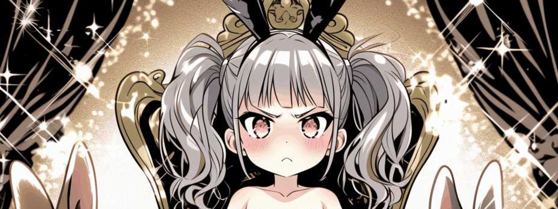 Highest quality, action, dynamic composition, a beautiful, charming, and intelligent kimono bunny girl (silver twin tails, side bangs, sideburns, glossy hair, two-tone coloring, large, beautiful pale pink eyes (downward slanting)) raised as a princess in a rabbit hutch. Background is pop (glittery). Japanese-style bunny girl suit (cute, enamel-like, black-based, vermilion embroidery). Two rabbits diligently tending to her, Bunny Girl sitting discontentedly on a queen's chair, anime-like beautiful face, full body (no missing limbs, no extra limbs), manga-style, anime-like beautiful face, full body (no missing limbs, no extra limbs)