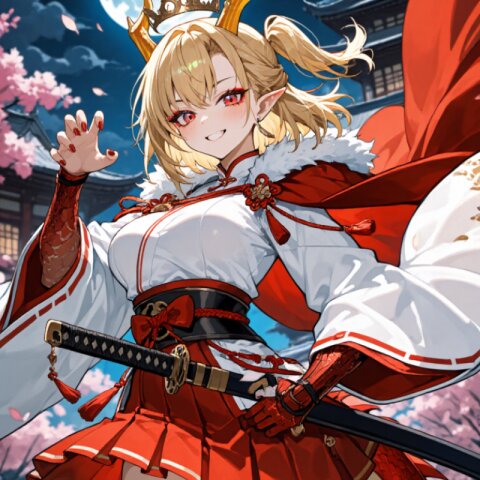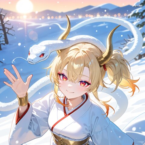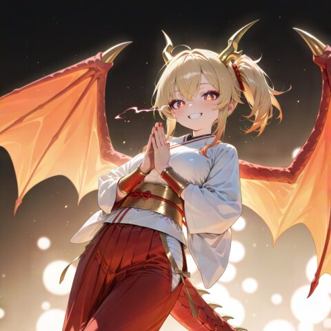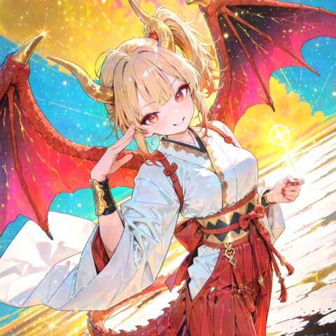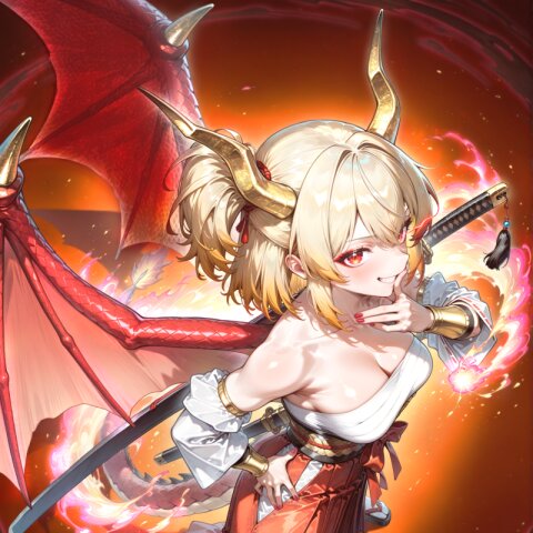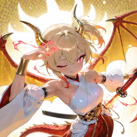 dragon girl, 18yo, (2dragon gold horns attached to head:1.2), (blonde hair:1.2) medium hair half updo hair up (side ponytail:1.3), red eyes beautiful iridescence eyes, (eyeshadow:1.2), cute, beautiful, (muscle,buff,ultra-detailed muscle:0.4) , first-rate female bodies perfect body framed breasts smart hips Average height, red nail polish, (red hakama:1.0) (overskirt:1.0) (White Japanese Clothes:1.0), sarashi inner, (White wide sleeve:1.0) gold and white stripe obi, bracer, straw sandals, tabi