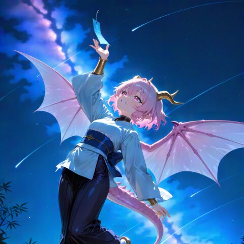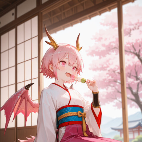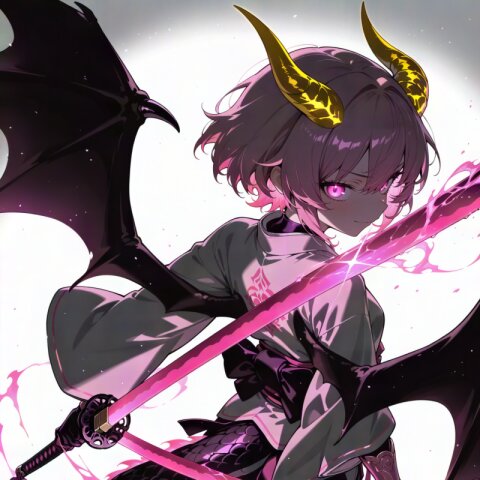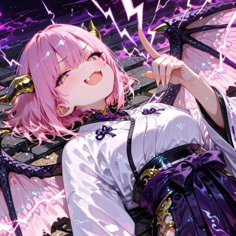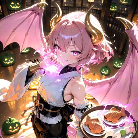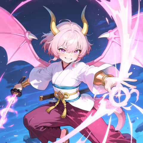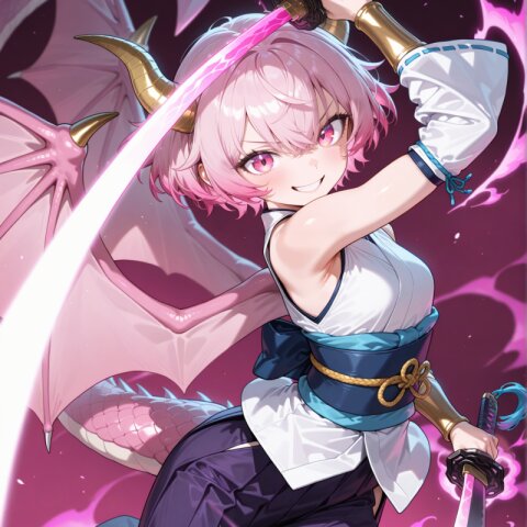 dragon girl, 15yo, (2dragon gold horns attached to head:1.2), (light pink hair:1.3), (doyagao:1.3), (wavy short hair:1.3), (beautiful pink eyes:1.3), cute, (muscle,buff,ultra-detailed muscle:0.4) , first-rate female body, perfect body, small breasts smart hips, bracer, dark {purple|pink} hakama,(overskirt:1.0) White Japanese Clothes , (White {detached|wide|long} sleeve:1.0), blue and white stripe obi, inner, straw sandals, tabi