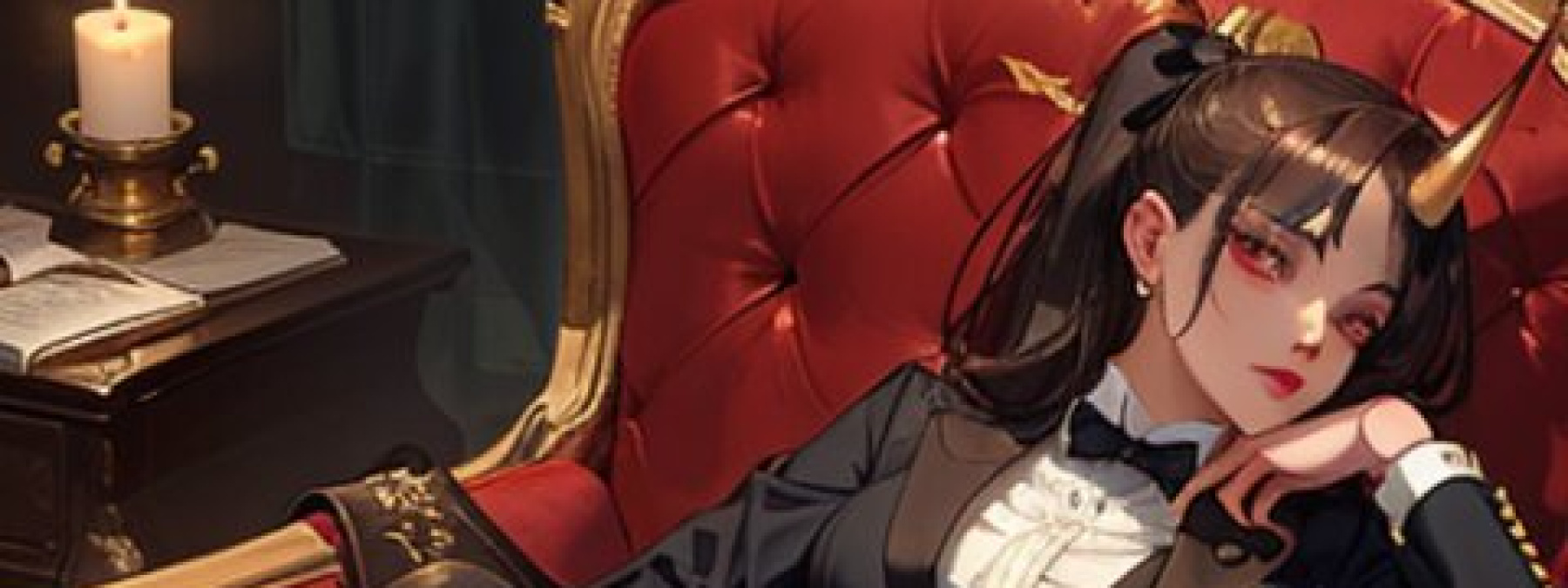 肌 薄いブラウンの艶肌 チョコレートのテンパリングを思わせる滑らかさ。香気を帯びる 髪 黒のポニーテール+バレット バレットは金属製で、ラズロズの紋章が刻まれている 顔 キレ目の美女+赤く厚めの唇 唇には“溶解の魔紋”が刻まれており、囁きで契約を誘導する ツノ 額に大きな一本ツノ 凝固の象徴。契約を“固定”する力を持つ 翼 黒翼 通常は折りたたみ、威圧時に展開。香気を拡散する 服 濃ブラウンのタキシード風レディスーツ+金刺繍 金刺繍は“契約の文様”。見る者に無意識の従属感を与える 履物 レザーブーツ ヒールの音が“命令”として響く。眷属はその音に従う