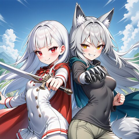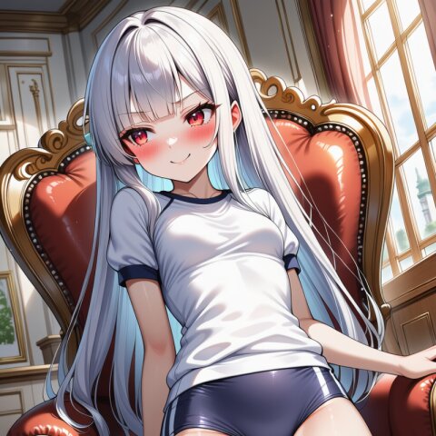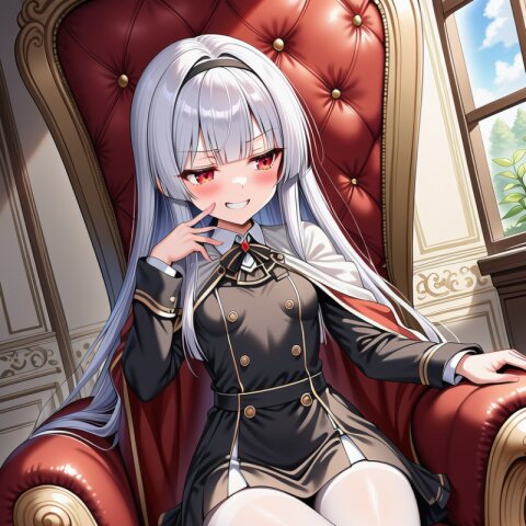 {ai-generated}, ai-assisted, {{{Japanese anime coloring}}}, {{year 2023}}, detailed fingers,1girl,solo,midday,{in Palace},white hair,straight hair,long hair,bangs,red eyes,slanted eyes,small breasts,skinny body,narrow waist,{small bottom}:8,{thin tighs}:6,thin legs,royal cape,{robe and decolletee},mini skirt,white pantyhose,sitting on jade throne,thrust a sword into floor,smile, masterpiece, best quality, ultra detailed, detailed fingers, high resolution, absurdres, perfect anotomy, detailed background, unity 8k wallpaper