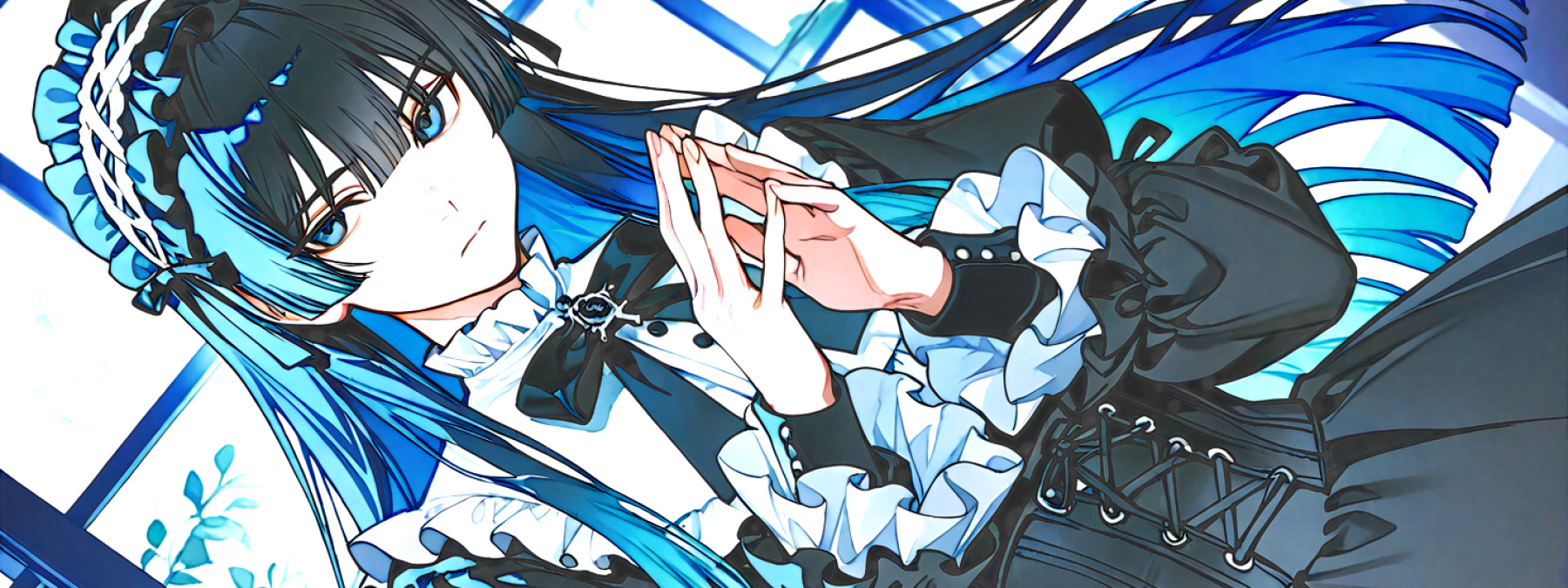 1boy, solo, long hair, black hair, hime cut, blue eyes, long sleeves,dress, hair between eyes, bow, ribbon,multicolored hair, male focus,frills, puffy sleeves, bowtie, black dress, black bow, gradient hair, neck ribbon, black ribbon,frilled sleeves, corset, black bowtie, frilled shirt collar, lolita fashion, cross-laced clothes, gothic lolita, lolita hairband, black corset,(detailed_hands:1.5),watercolor,mksl_style