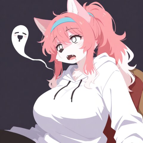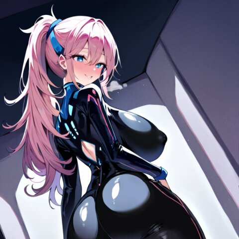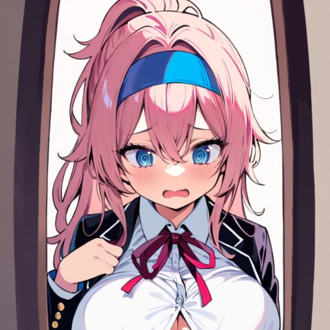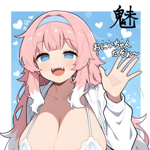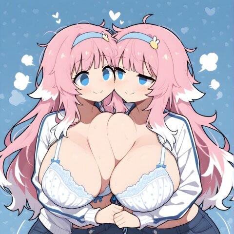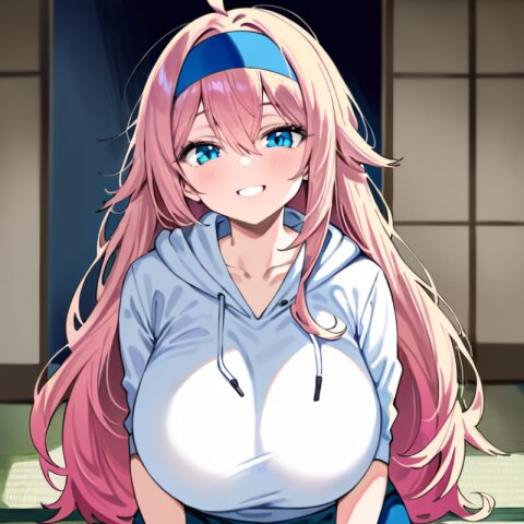 (Moe cute),beautiful face,cutie,enormous breasts,messy hair,pink hair,long hair,smile,blue eyes,pink lips,blue headband,white hoodie,black pantyhose