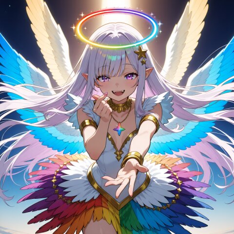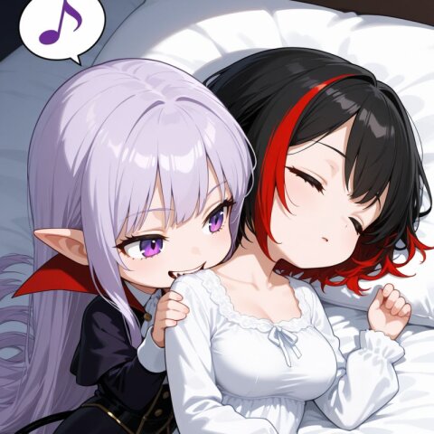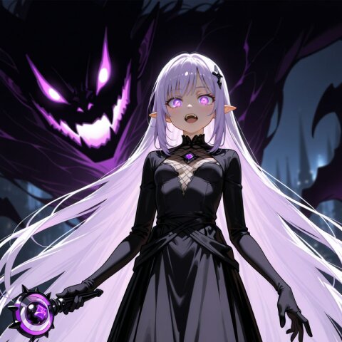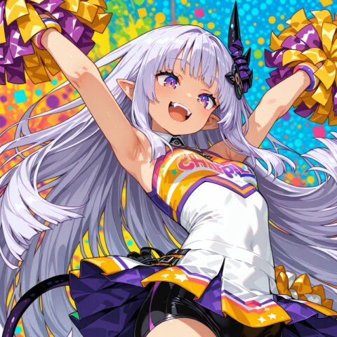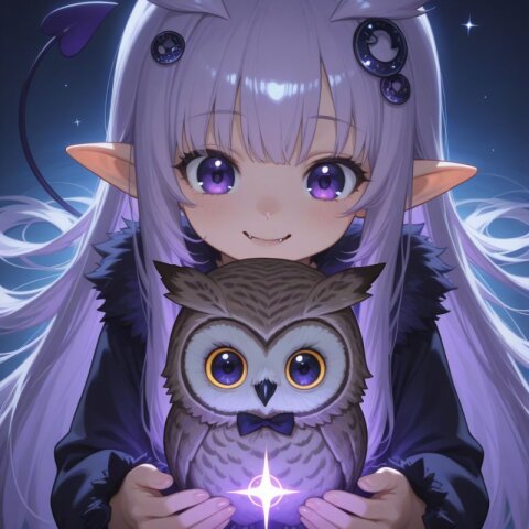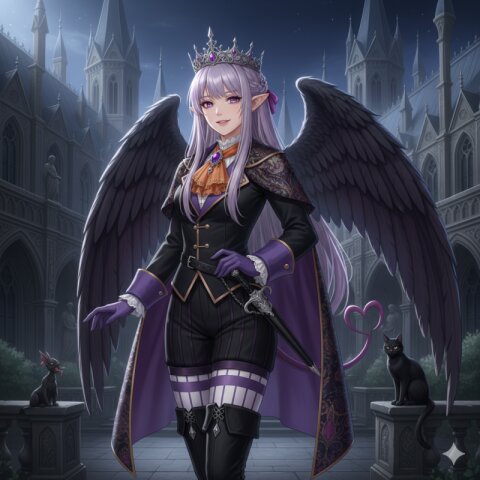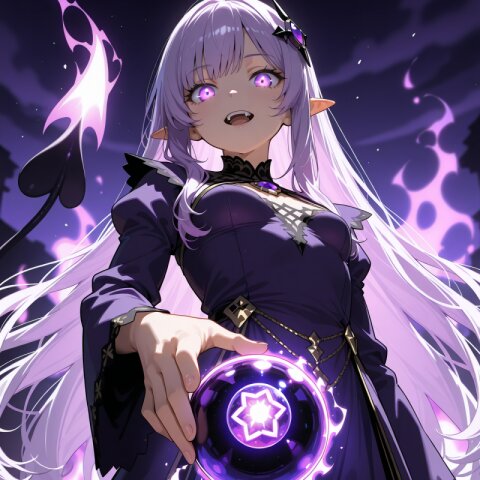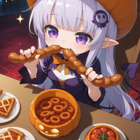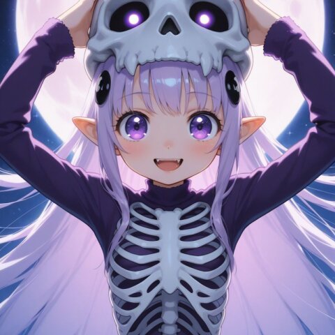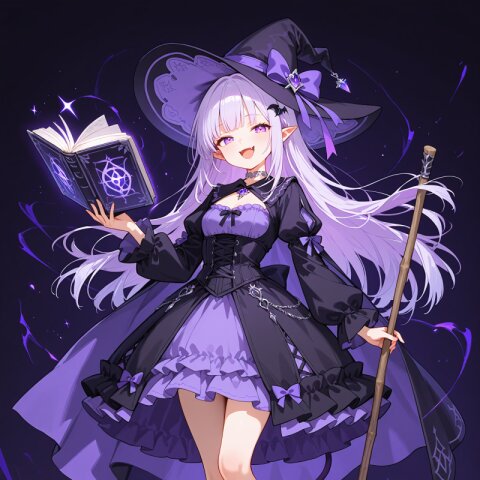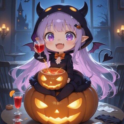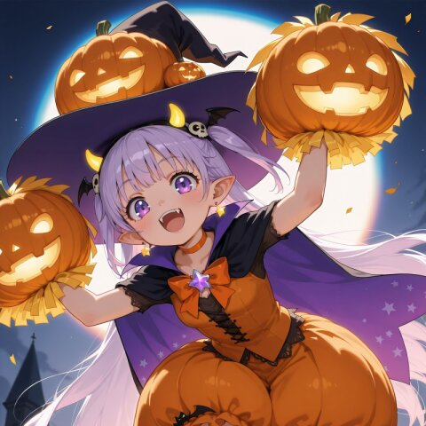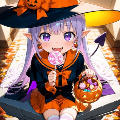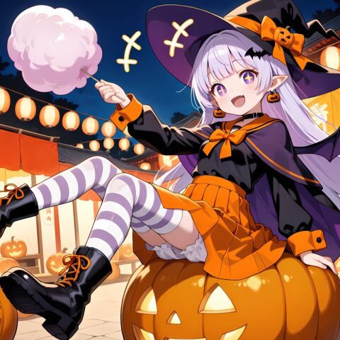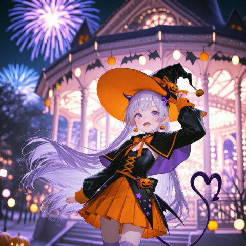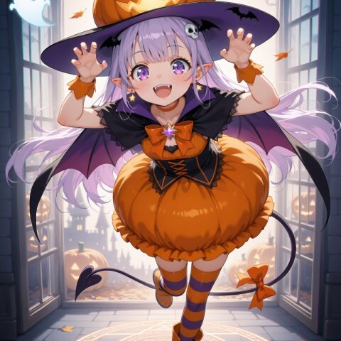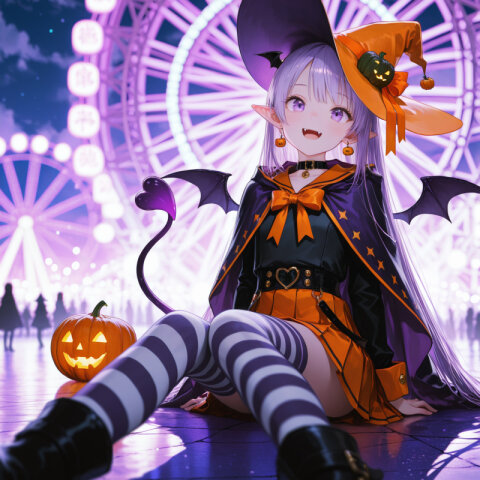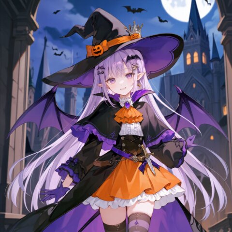 straight hair, medium bangs, naturally flowing hair, left bat hair ornament, Light purple hair, very long hair, purple eyes, pointy ears, fangs, closed mouth, smile, small breasts, heart tail, purple tail, devil's tail, cute room, orange hat ribbon, black witch hat, witch, full dress, fake wings, mini pumpkin earrings, mini pumpkin hat ornament, Pleated skirt, black cape, two-sided cape, multicolored cape, purple cape, capelet, mini pumpkin bow, orange bowtie, orange ribbon, black choker, white purple legwear, striped legwear, thighhighs, red neckwear, black collar, orange sailor collar, Long sleeves, black shirt, orange skirt, black boots, Orange cuffs, white strings on clothes, White decorative strings used on clothing, White strings to tie clothes,