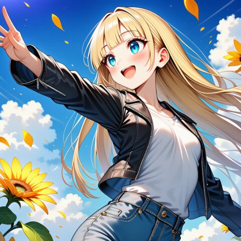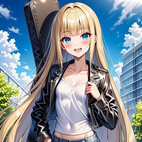 {ai-generated}, ai-assisted, {{{Japanese anime coloring}}}, {{year 2023}}, detailed fingers,1girl,solo,playing guitar,blonde hair,{straight hair},long hair,{blunt bangs (hime-cut)},blue eyes,droopy eyes,small breasts,skinny body,narrow waist,{small bottom}:8,{thin tighs}:2,thin legs,{leather jacket},{chain necklace},shirt,denim skirt,black stockings (zettai ryoiki),boots,{hold an electric guitar in hands},smug,full body, masterpiece, best quality, ultra detailed, detailed fingers, high resolution, absurdres, perfect anotomy, detailed background, unity 8k wallpaper