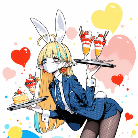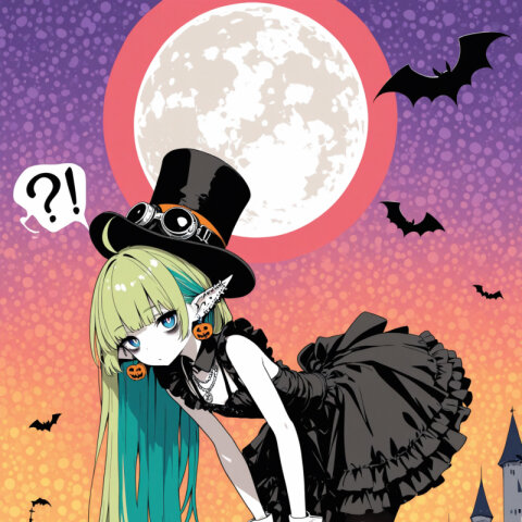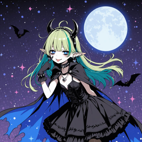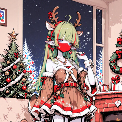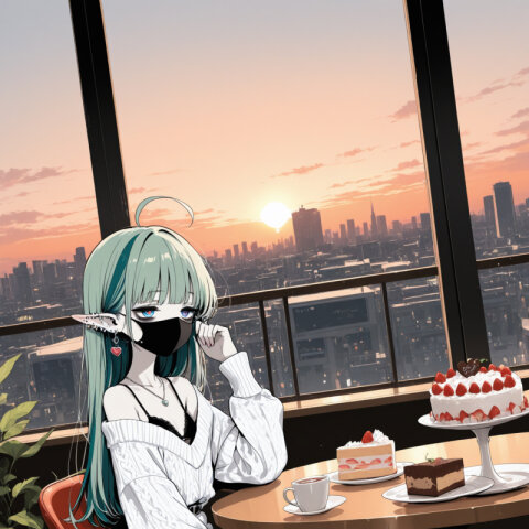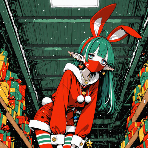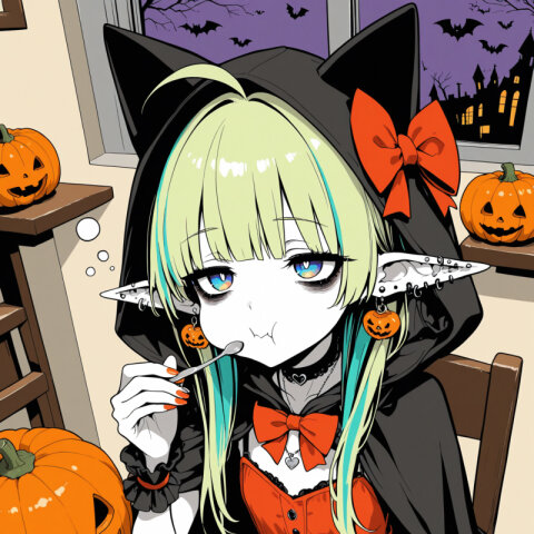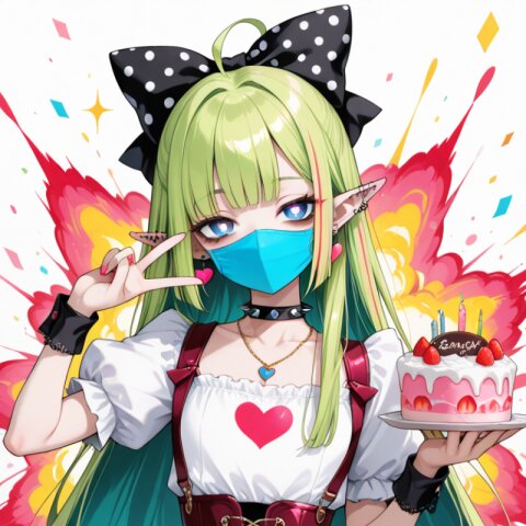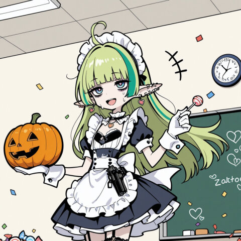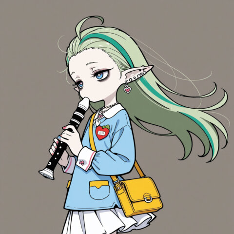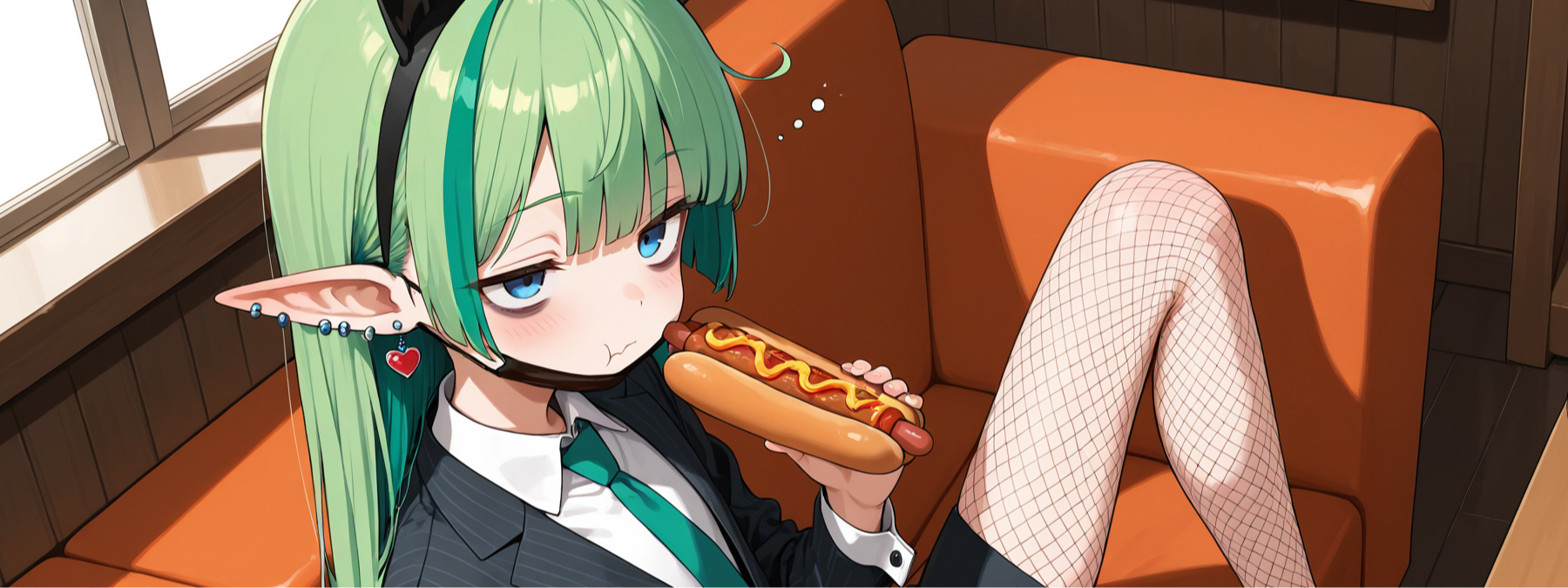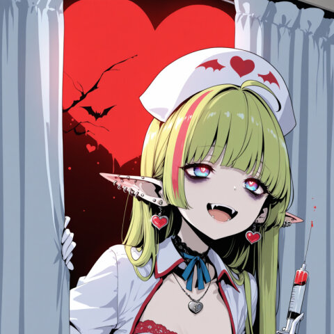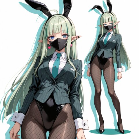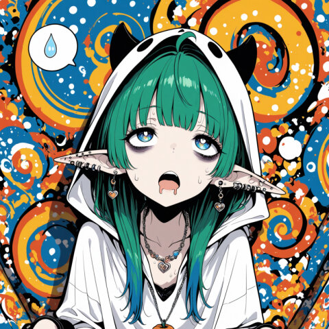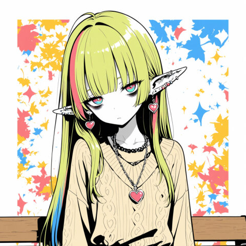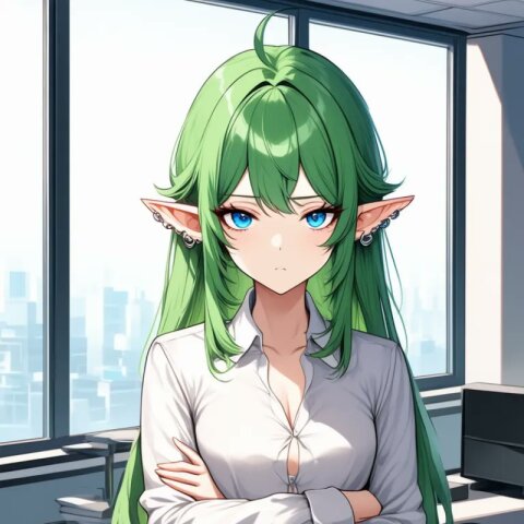 特徴:姫カット、緑髪、アホ毛、青い目、目の隈、貧乳、エルフ、大量のピアス