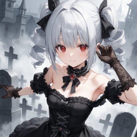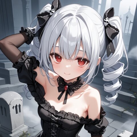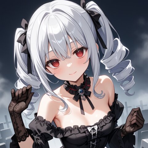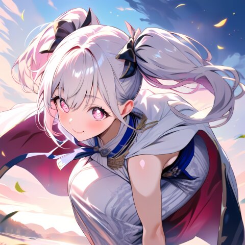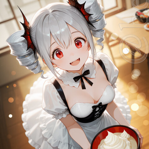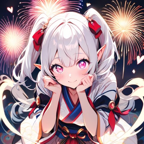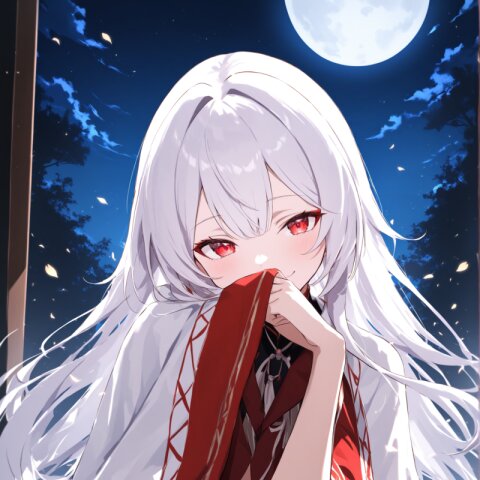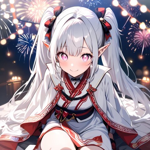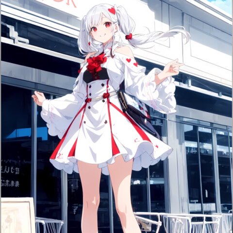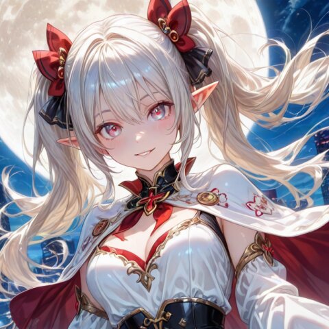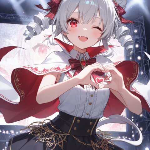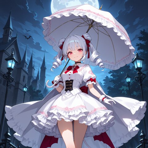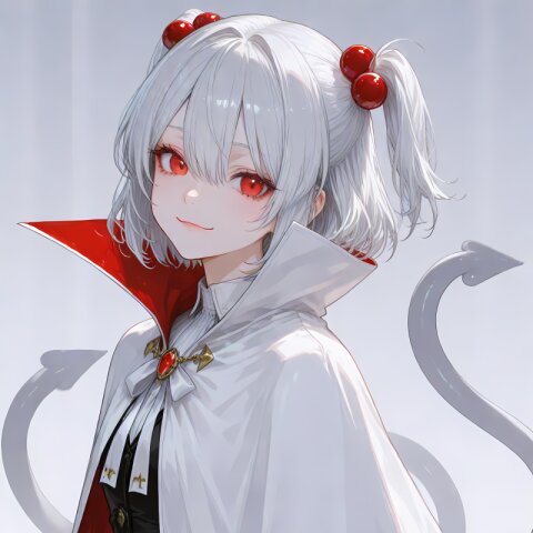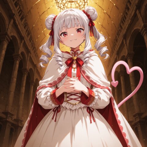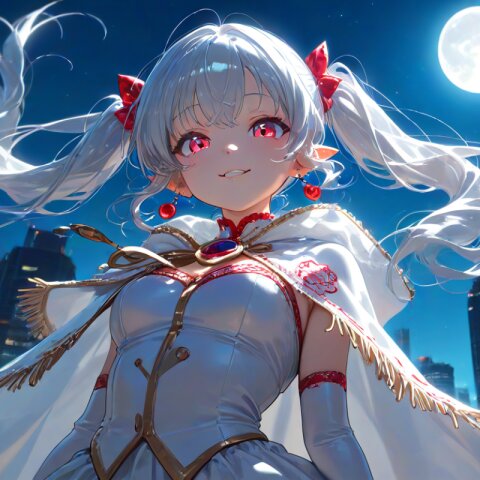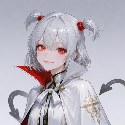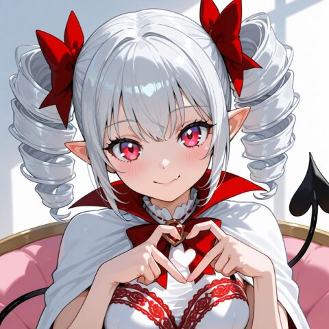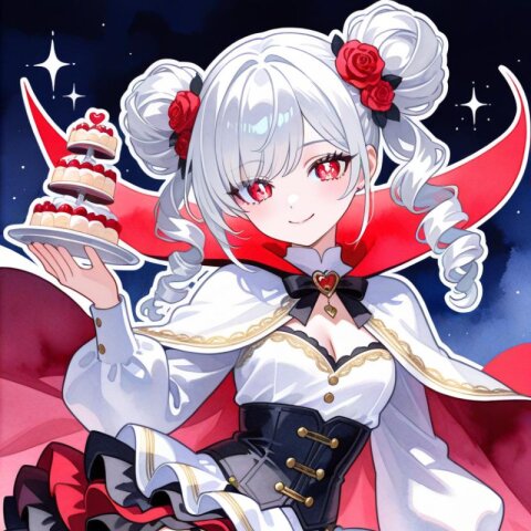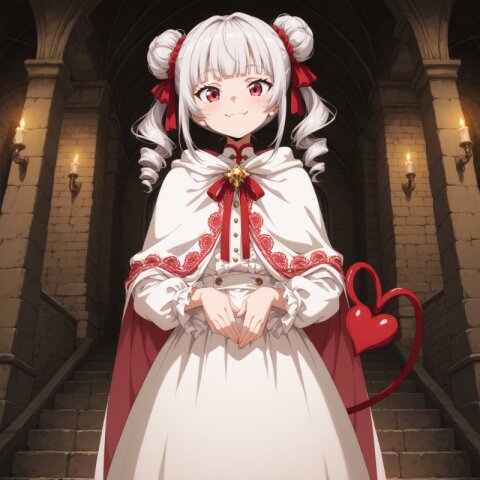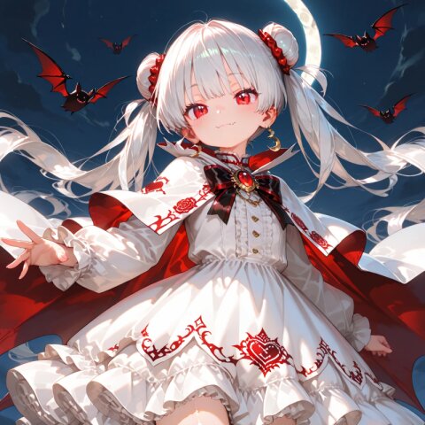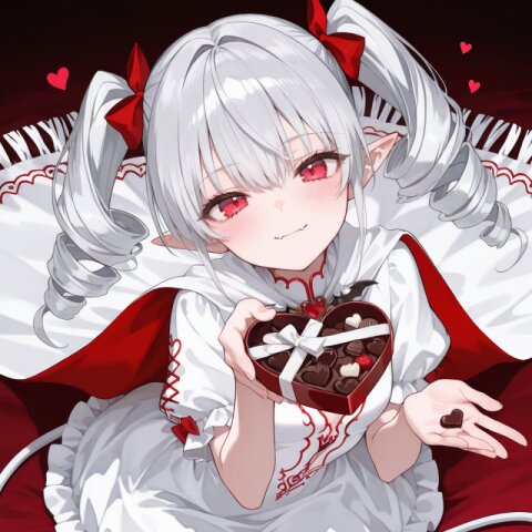 Top quality, beautiful attractive and intelligent female vampire in white cape (twin-tail white silver hair, side bank, fringe, glossy, two-tone, big beautiful light red eyes (droopy)), white pambaia style (white base, red embroidery), nihilistic smile, heart, offering chocolate, anime like. Beautiful face, full body (no missing limbs, no excess limbs).