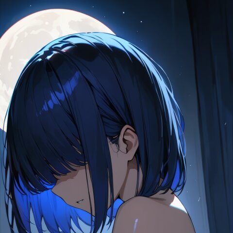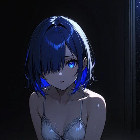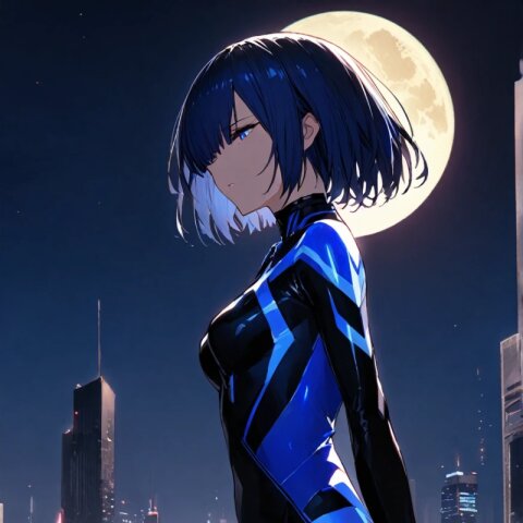 (masterpiece)、(absurdres)、solo girl、slender:1.1、shiny ultramarine hair、straight hair、short bobcut:1.1、hair covering one eye:1.1、small breast:0.8、ultramarine eyes、irisless eyes、(black and blue battlesuit)