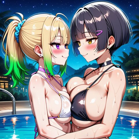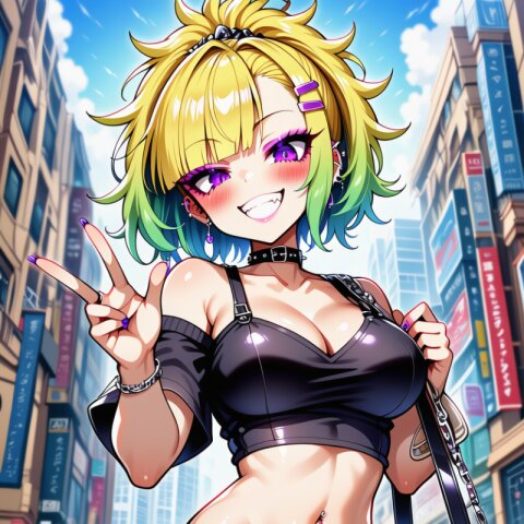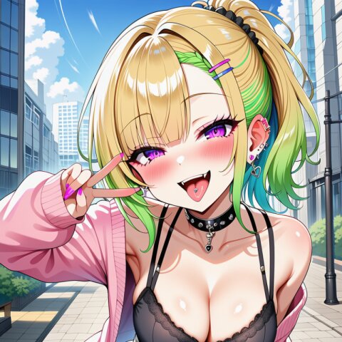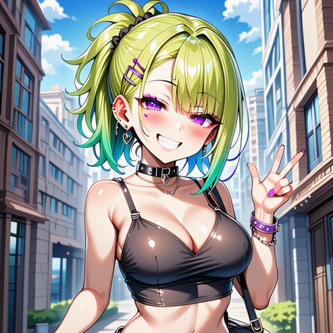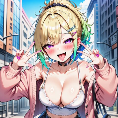 2.0::childish look::, gal, 0.5::make up::, multi color hair, blonde hair, green hair, medium hair, 1.5::messy ponytail::, french twist, asymmetry bangs, squinting eyes, droopy eyes, purple eyes, big breasts, 1.0::petite body::, narrow waist, 2.0::petite hip::, 2.0::petite tighs::, hairpin, choker, cardigan, camisole, leather belt, tulle mini skirt, nail polish, tongue piercing, handbag, smile