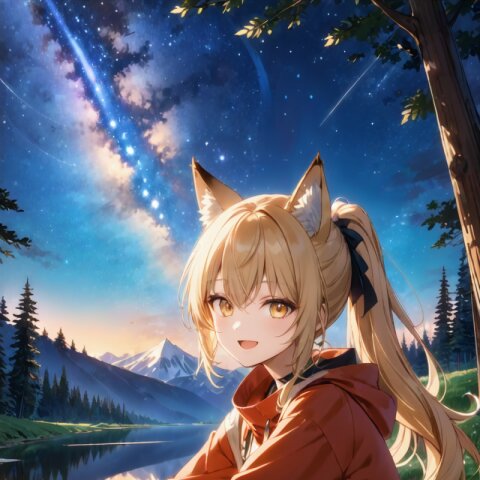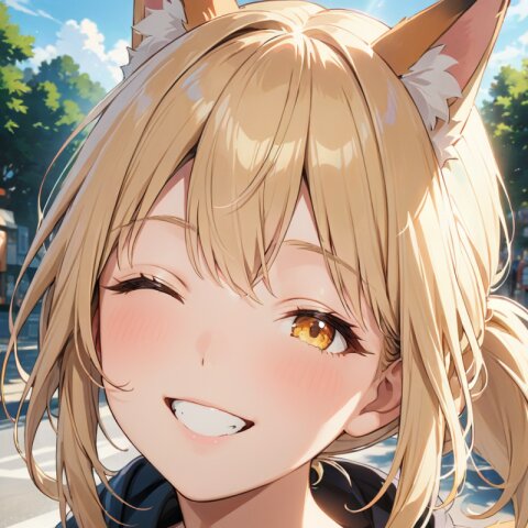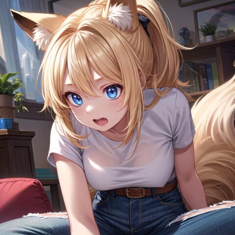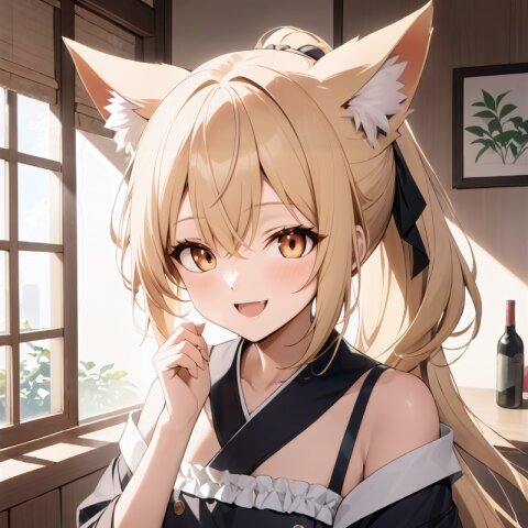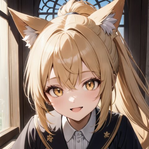 1girl, fox girl, fox tail, blonde hair, (ponytail:1.3), shiny hair, (high detailed eyes, highlight eyes:1.2), blonde eyes, (delicate beautiful face, super detailed skin:1.2), Slightly open mouth, (smile:1.2), perfect light, detailed background, medium long shot, (masterpiece:1.2), (best quality:1.2), (ultra-detailed:1.2),