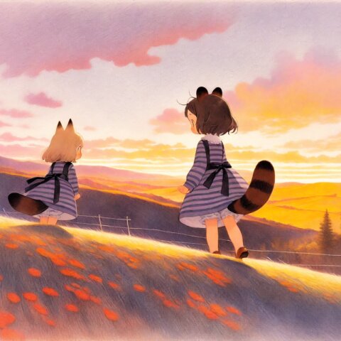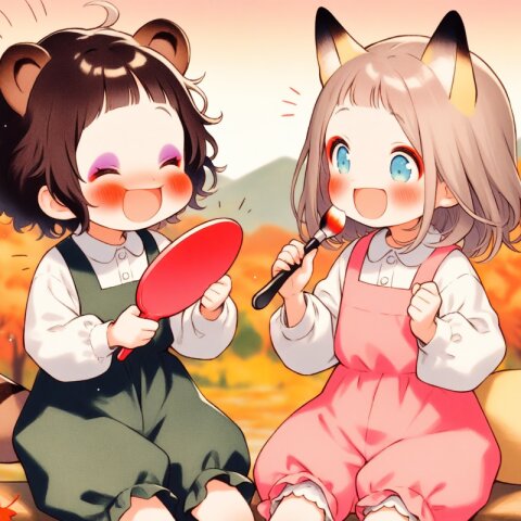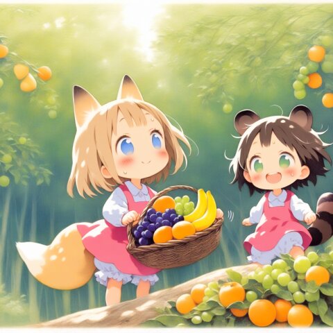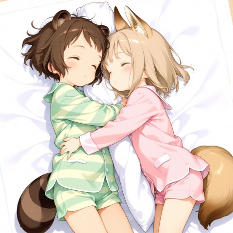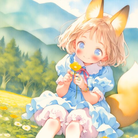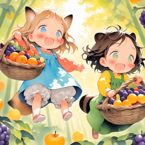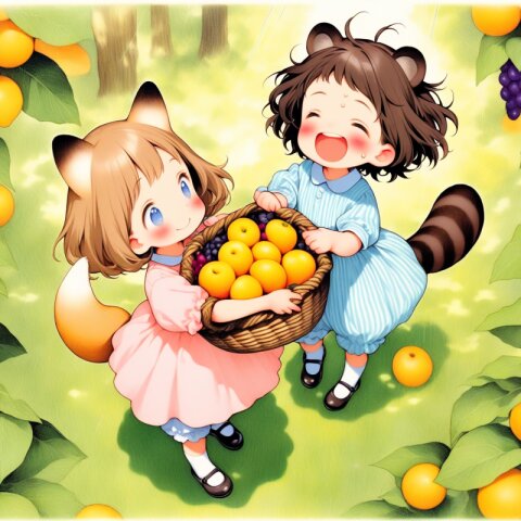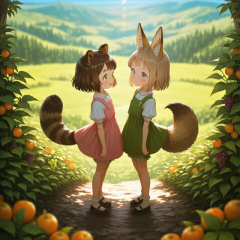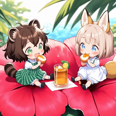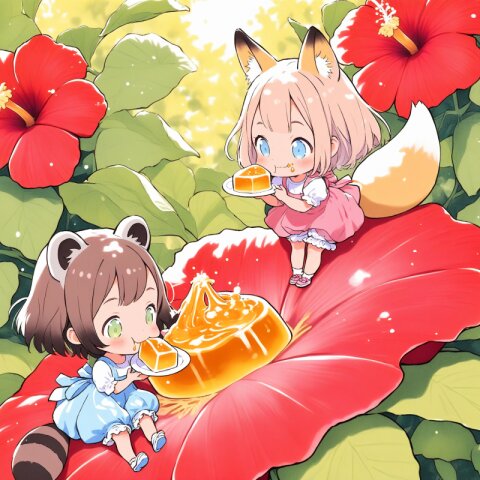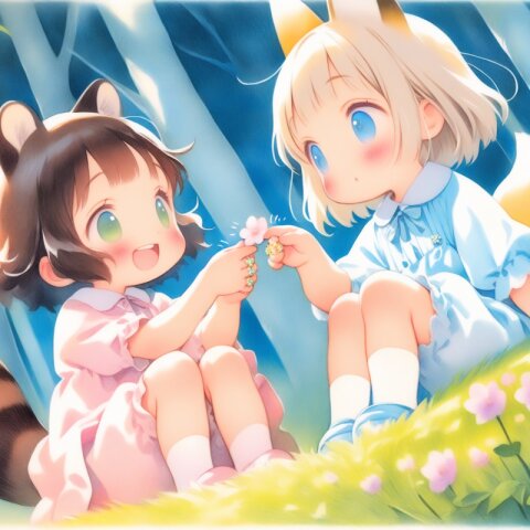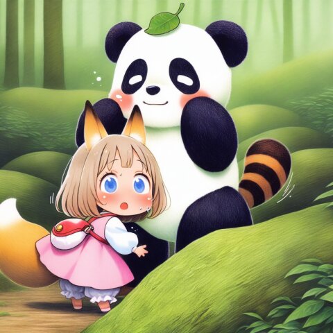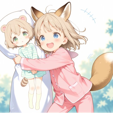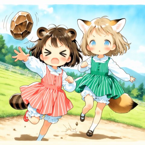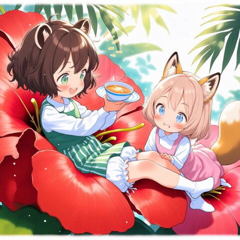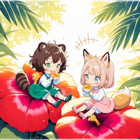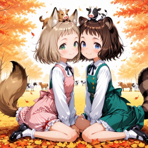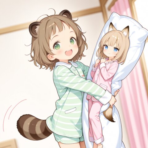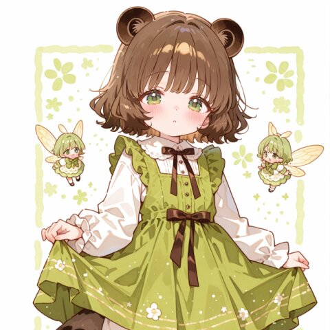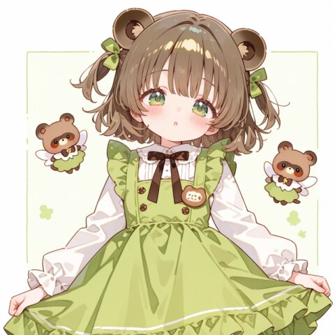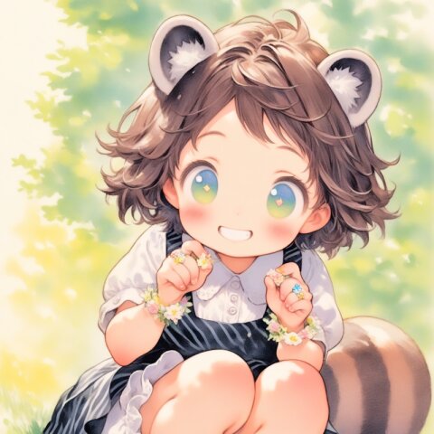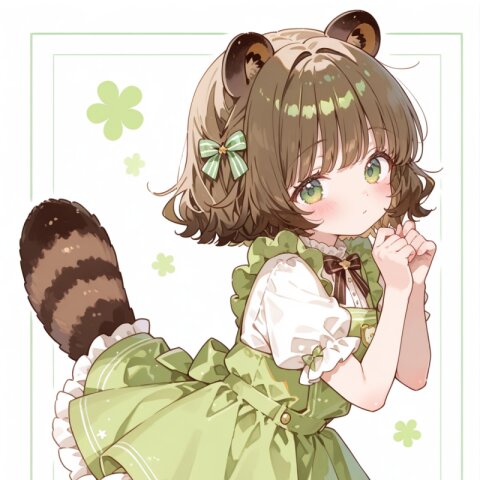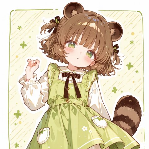 1girl, solo, loli, dark brown hair, short hair, messy hair, short bangs, green eyes, tareme, (dark brown raccoon ears, dark brown raccoon tail with striped pattern), pinafore dress, frilled pastel green dress, Overlapping multiple ruffles, ribbon, socks, frilled bloomers,