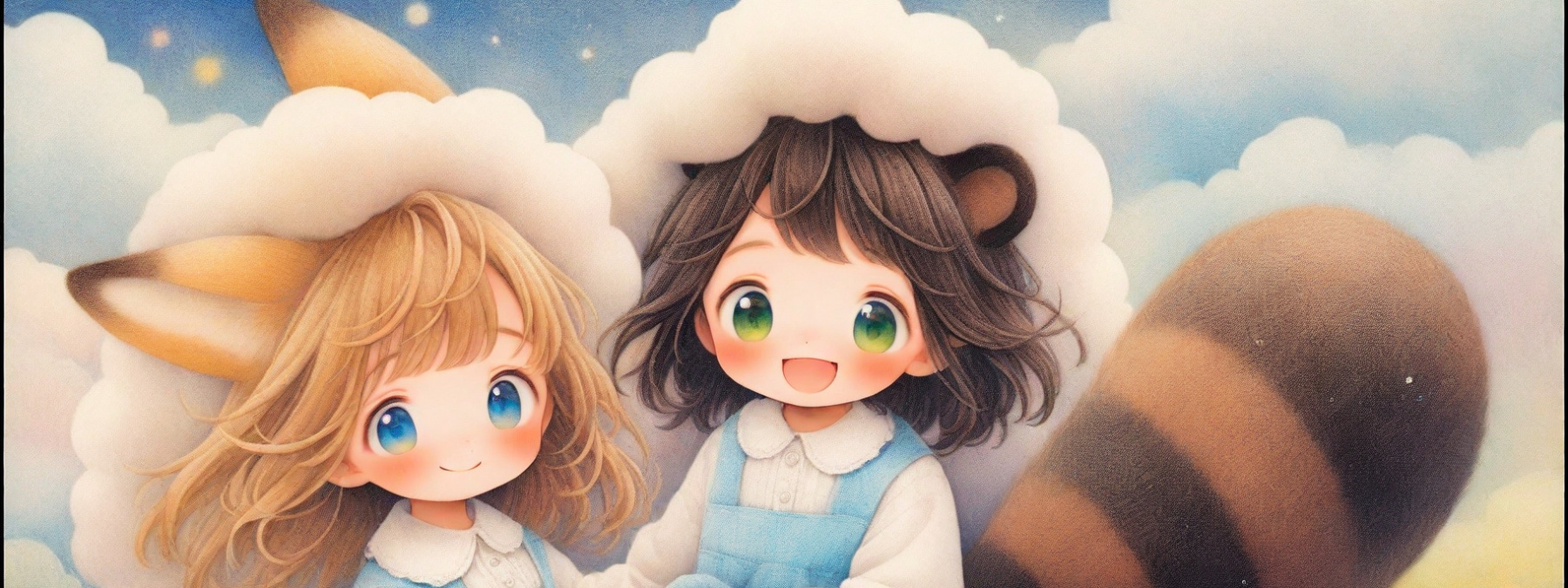 BREAK loli, light brown hair, medium hair, choppy bangs, blue eyes, (light brown fox ears, Light brown fox tail with white tip, petite), pink pinafore dress, frilled bloomers, happy smile, BREAK loli, dark brown hair, short hair, messy hair, short bangs, green eyes, tareme, (dark brown raccoon ears, dark brown raccoon tail with striped pattern), green pinafore dress, frilled bloomers, happy laughing,