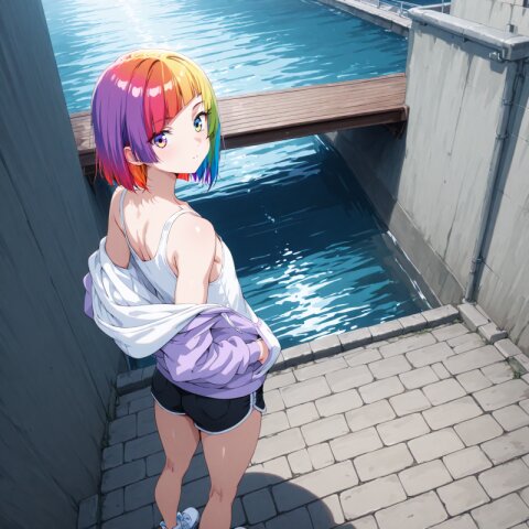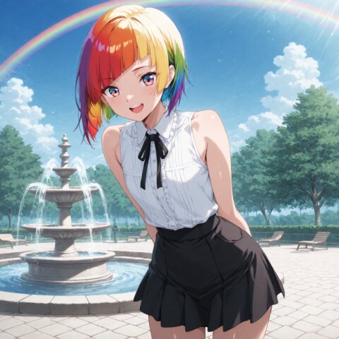 虹色の髪と瞳は本来透明で色がない。光の反射で様々な角度や感情から色や表情を変える