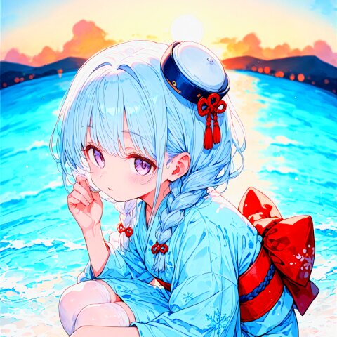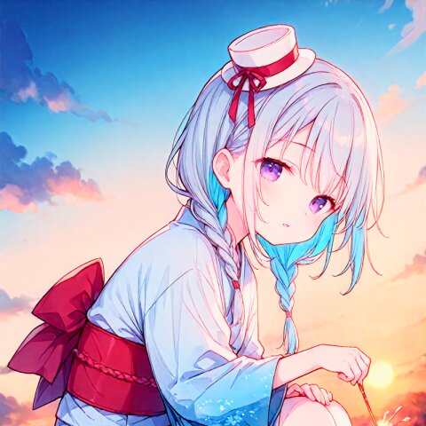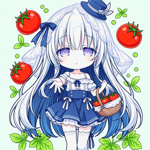 collarbone,parted lips,(Expressionless,:0.8), big eyes,(half-closed eyes:0.8), tareme,pale purple eyes, thighhighs, (silver hair:1.1),(dark blue hair colored inner hair:0.8), long hair,very long hair,eyebrows visible through hair, white off-shoulder and dark blue skirt, see-through veil,mini hat,blue strapping ribbon and bow, frills,strapping ribbon, choker,temptation,