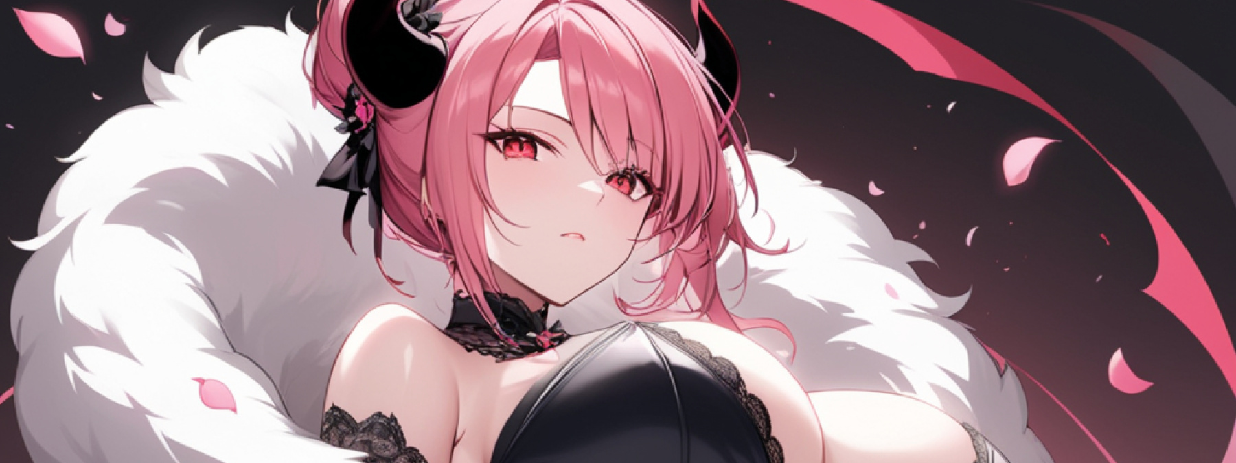 1girl, upper body, detailed skin, devil_horns, detailed hair, pink hair, parted bangs, single hair bun, detailed eyes, red eyes, makeup, serious:1.2, closed mouth, huge boobs:1.3, gorgeous decoration dress, Gothic black dress, Jewelry neck, Fur Coat,