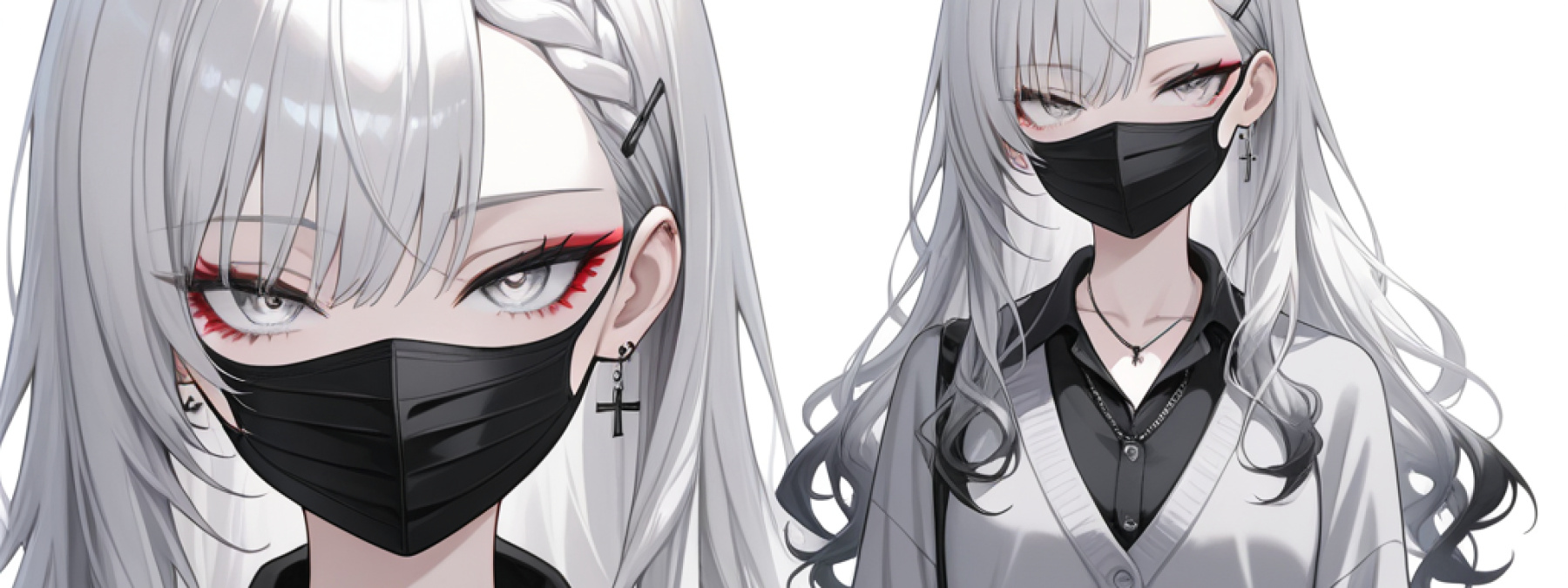 gyaru,cool beauty, white_skin,fair_skin,slender,small_breasts,(medium breasts:0.8), tsurime,half-closed eyes,(silver eyes:1.1),(red eyeliner:0.8), (silver hair),long hair,bangs,braided bangs, black cross necklace,black cross hair pinblack mouth mask, collared_shirt,black_shirt,gray cardigan,untucked_shirt,skirt,school uniform,have a iPhone,