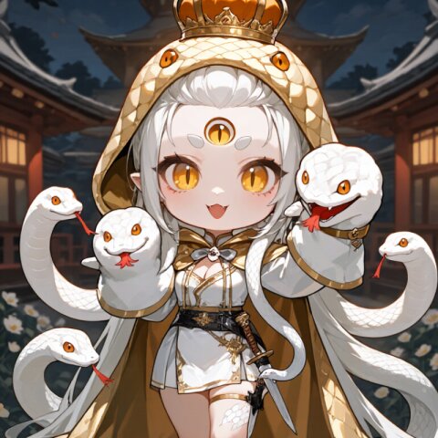 1 girl, solo, full body, from above, look up, A hand puppet shaped like a snake's head, Snake stuffed gloves, Fluffy gloves with Snake characters, A person with a third eye on their forehead, mystical and spiritual, hair intakes, A person with two long bangs split in the middle, shaped like sharp fangs, highly detailed, photorealistic, hair styled in a center-parted slicked-back look. (snake hair), with long, shimmery white snake hair that flows down to waist, A tall, slender child, fair white skin, slightly sharp fangs, Gold snake head hood, food down, Gold and silver snake hood, golden Lamia, hidden feet, golden eyes, slit pupils, round eyebrows. The character is fair-skinned, has slightly sharp long fangs, Scaly Skin, scales, sharp teeth, sleeves past wrists, (chibi:2.0), (1girl, solo):4.0, Fascinating hairstyles, fascinating costumes, clothing, outdoor, looking at viewer, cowboy shot,