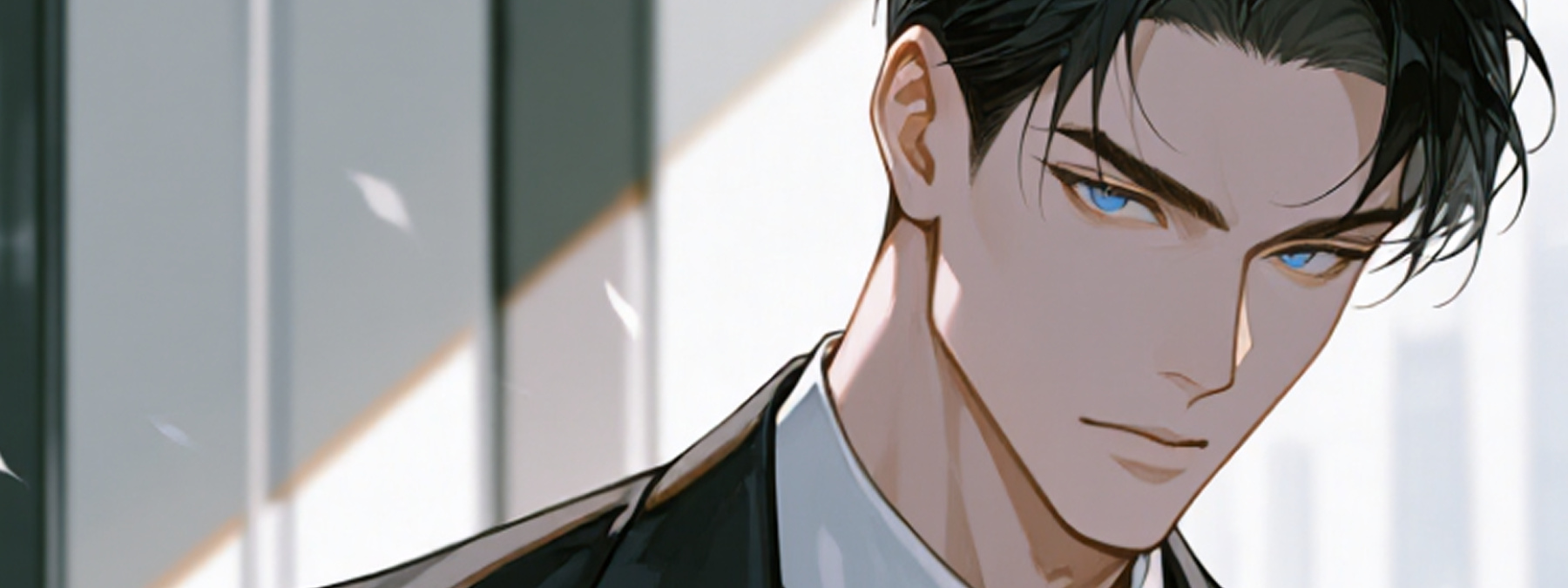 A stylish Asian man in his thirties. He possesses distinctive facial features, including jet-black hair at the back of his head and a strong jawline. His captivating blue eyes are narrowed sharply, conveying a deliberately intense expression. His physique is broad-shouldered and muscular. He wears a perfectly tailored black suit, paired with a matching black vest and a gray patterned tie. The suit fabric appears smooth, accentuating its refined silhouette.