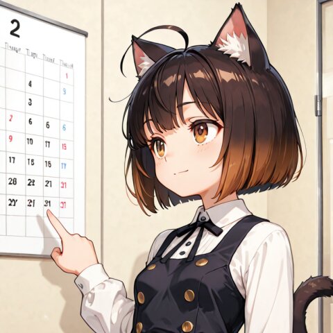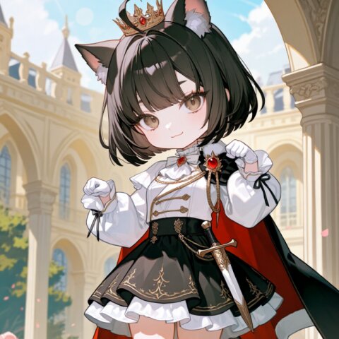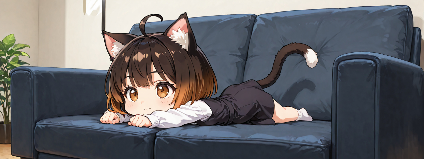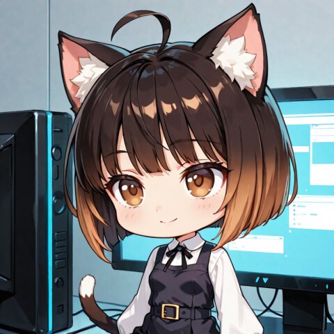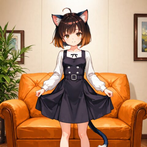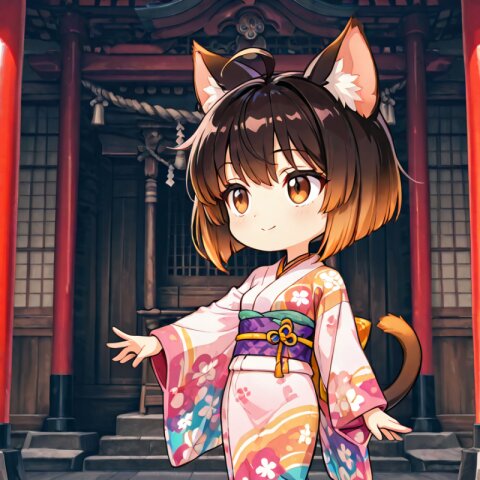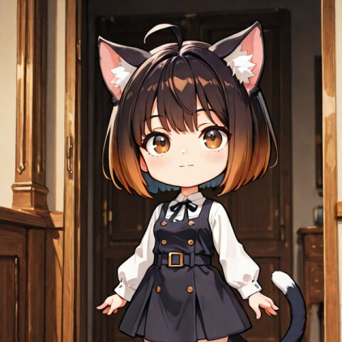 (chibi:0.9),girl, teenage, small breasts, petite, round face, upturned eyes, brown eyes, bob cut, ahoge, black gradient hair, cat ears and a cat tail, small smile