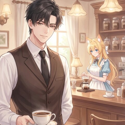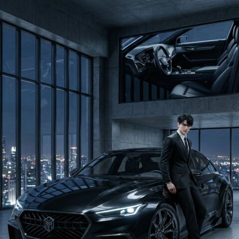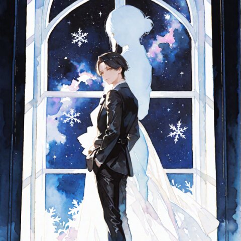 breathtakingly handsome young Japanese man, dark slightly tousled black hair swept back with a few strands falling across his forehead, pale brown eyes with a quiet, melancholic glow, long eyelashes, refined facial features, elegant jawline, smooth pale skin, perfectly balanced proportions, clean and sharp line art. Wearing a beautifully tailored black suit, subtle sheen, slim silhouette, matching black tie, crisp white dress shirt, ultra-detailed fabric texture, realistic folds, high-quality leather shoes, neat and refined styling.