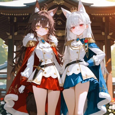 {ai-generated}, ai-assisted, {{{Japanese anime coloring}}}, {{year 2023}}, detailed fingers,2girls,character sheet,{fox ears},long hair,bangs,skinny body,narrow waist,fox tail,{small bottom}:8,{thin tighs}:2,thin legs,{miko costume},mini skirt,{brown hair girl is (messy hair,yellow eyes (jitome),droopy eyes,small breasts,smile)},{white hair girl is (straight hair,red eyes,slanted eyes,flat chest,smug)},full body, masterpiece, best quality, ultra detailed, detailed fingers, high resolution, absurdres, perfect anotomy, detailed background, unity 8k wallpaper