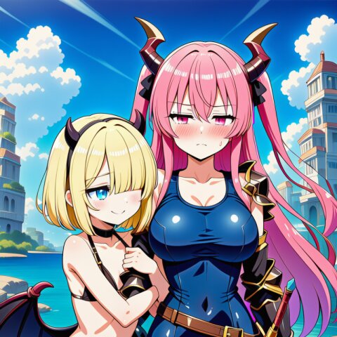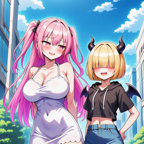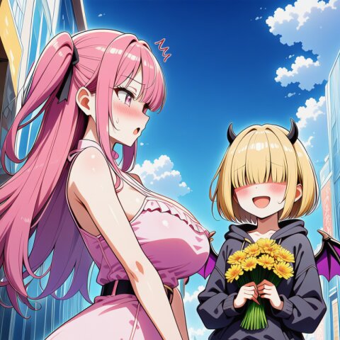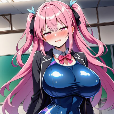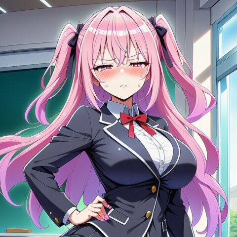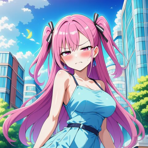 {ai-generated}, ai-assisted, {{{Japanese anime coloring}}}, {{year 2023}}, detailed fingers,1girl,solo,outdoor,{in sunny Tokyo},pink hair,two side up,long hair,bangs,squinting eyes,pink eyes,big breasts,skinny body,narrow waist,{small bottom}:8,{thin tighs}:6,thin legs,{school blazer},mini skirt,socks,loafers,standing on intersection, masterpiece, best quality, ultra detailed, detailed fingers, high resolution, absurdres, perfect anotomy, detailed background, unity 8k wallpaper