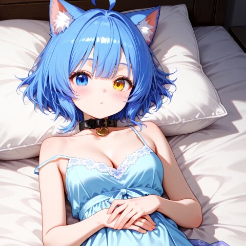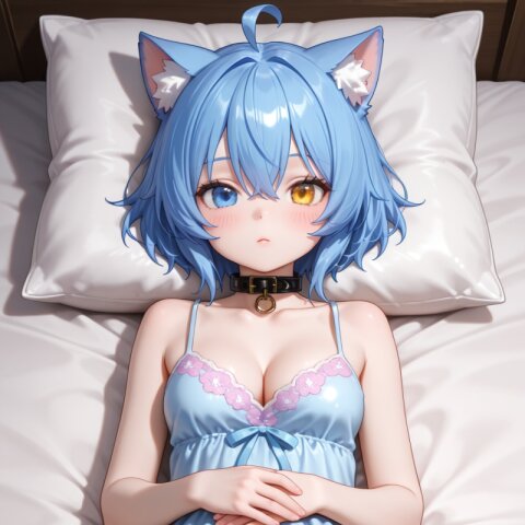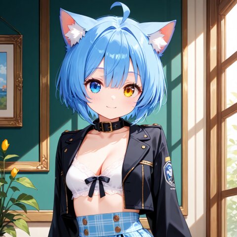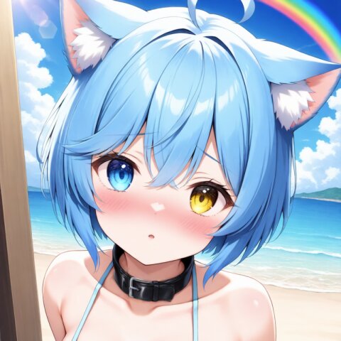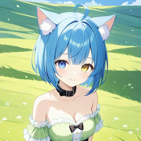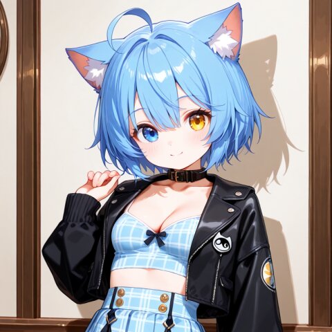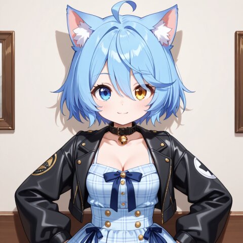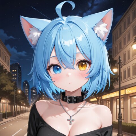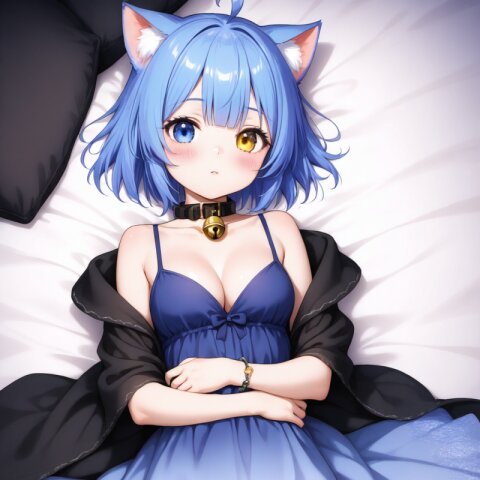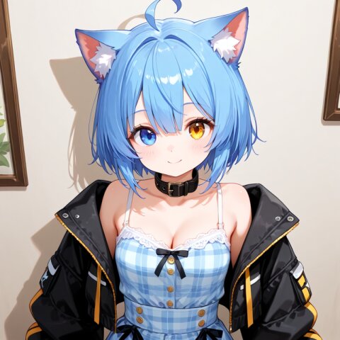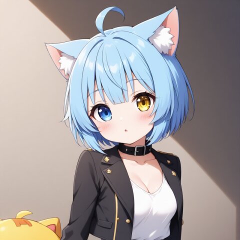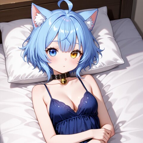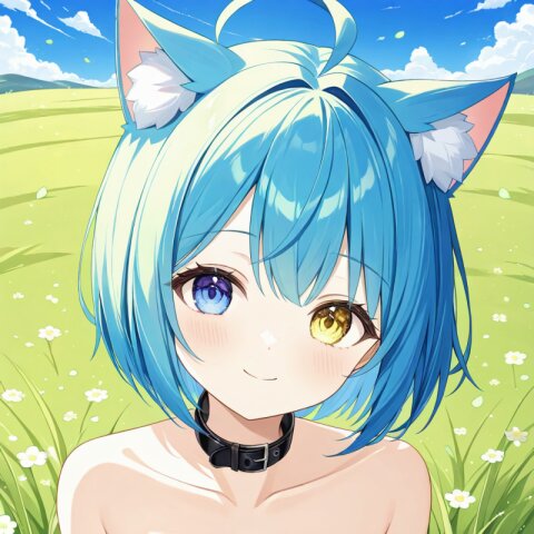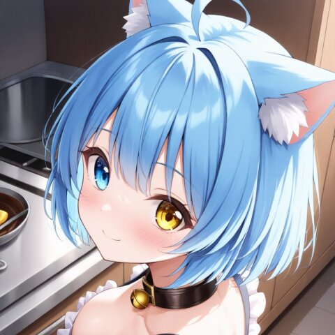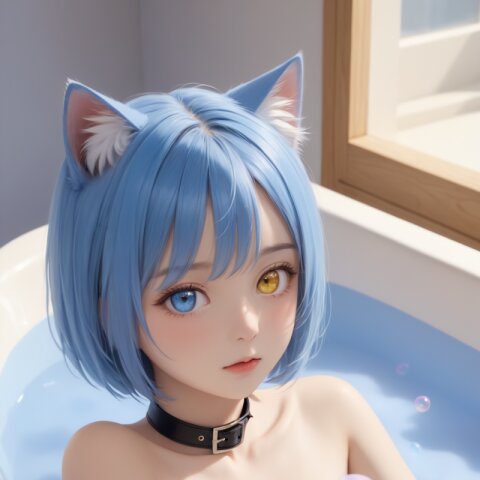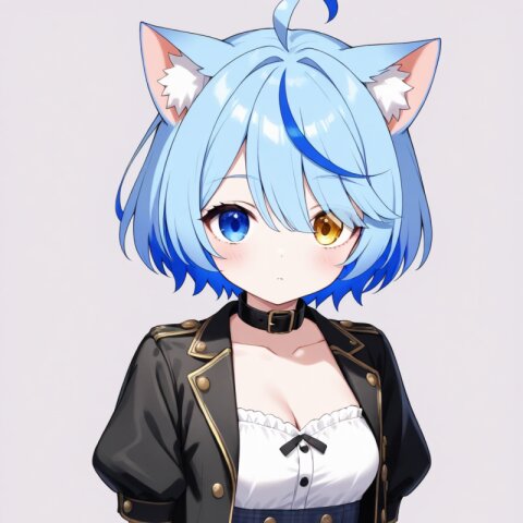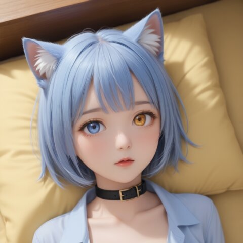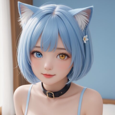 sky blue hair, ((short hair)), (cross-over bangs), sky blue cat ears, cat ears white fluff, pink inner cat ears, ((hidden human ears)), ((covered ears with hair)), ahoge, (heterochromia), (navy blue right eye), (deep brownish yellow left eye), (detailed eyes), (beautiful eyes), cute eyes, (black leather collar), collarbone,