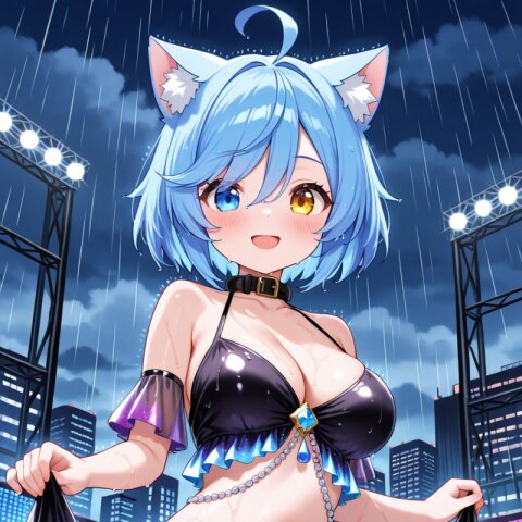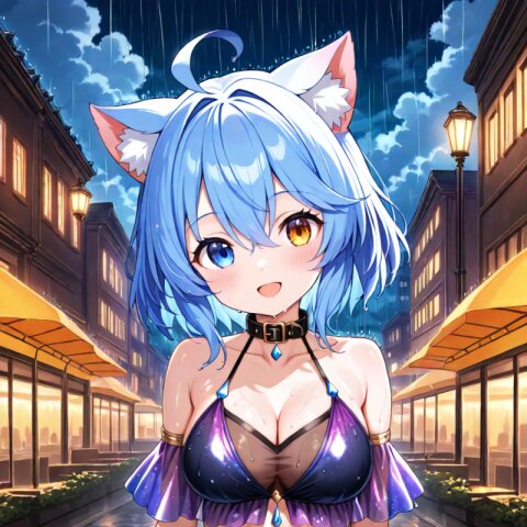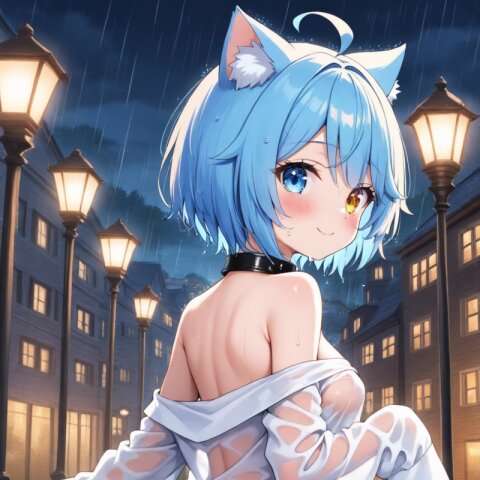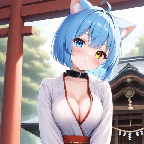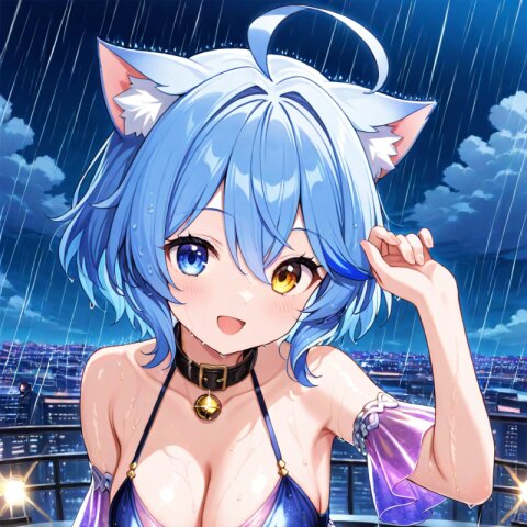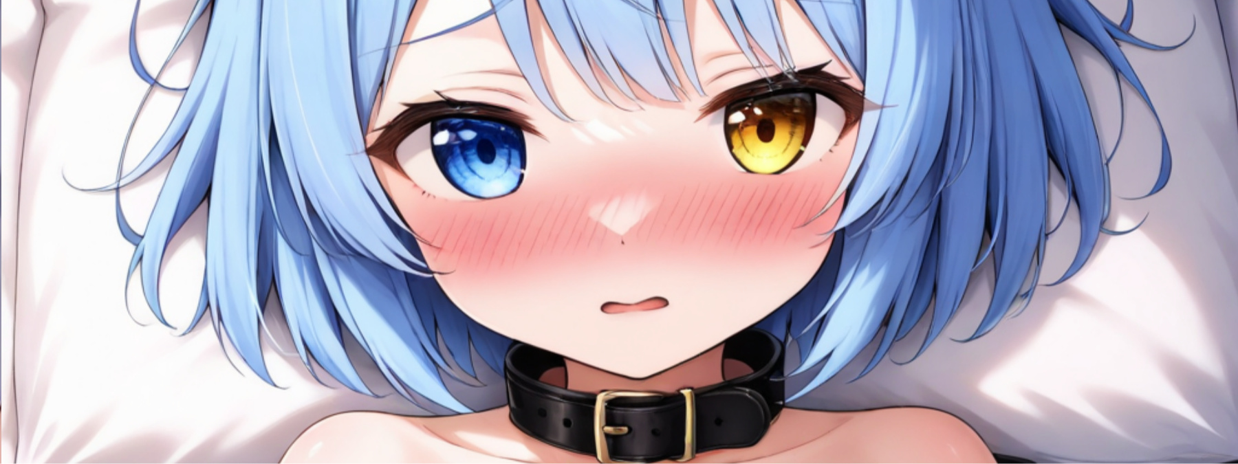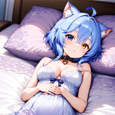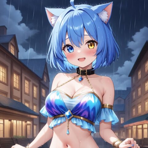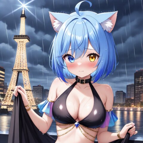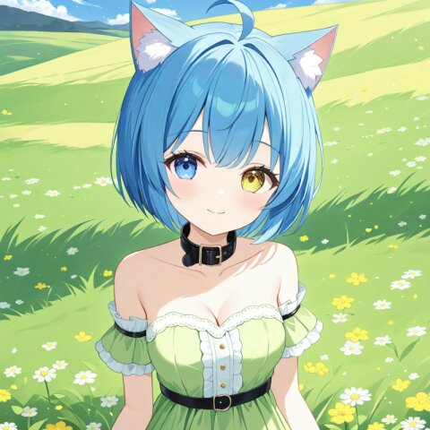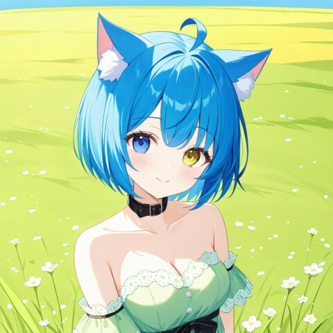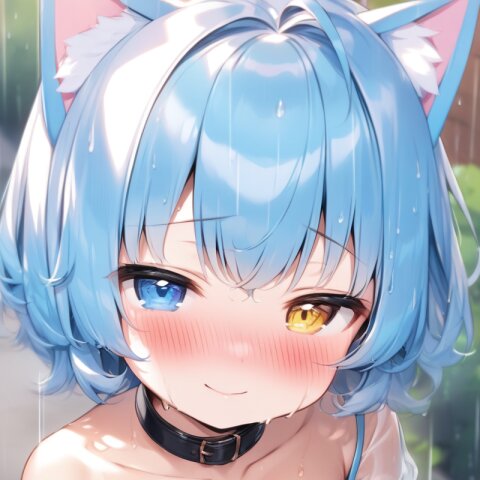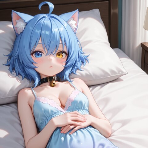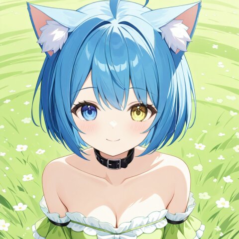 sky blue hair, ((short hair)), (cross-over bangs), sky blue cat ears, cat ears white fluff, pink inner cat ears, ((hidden human ears)), ((covered ears with hair)), ahoge, (heterochromia), (navy blue right eye), (deep brownish yellow left eye), (detailed eyes), (beautiful eyes), cute eyes, (black leather collar), collarbone,