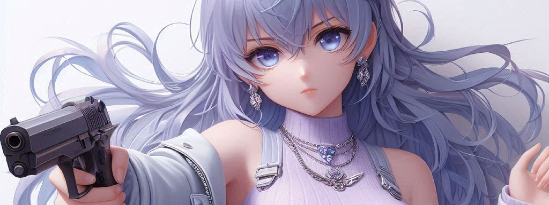 ((Masterpiece, highest quality, super detailed, 8k)) A 22-year-old girl, with soft, light blue hair down to her waist, clear blue eyes, light makeup, a pale violet turtleneck tight mini dress, a white leather jacket, white boots, a silver chain waist ornament, a small crescent-shaped silver necklace, dynamic, gun-firing pose, elbows bent, (anime:1.4) The background is a night city, the background is blurred, a gentle smile