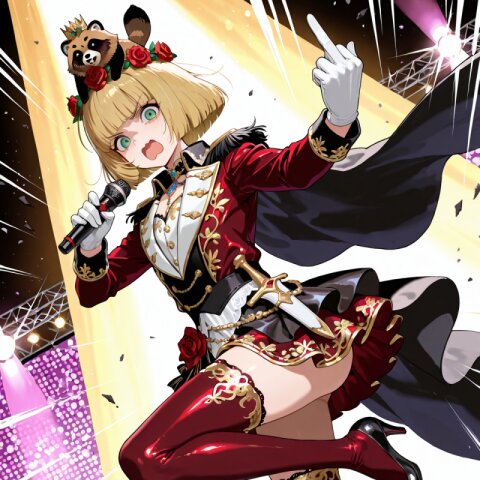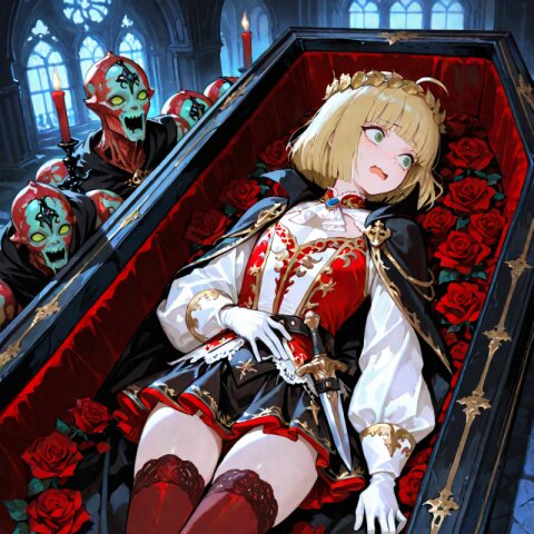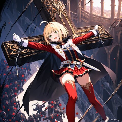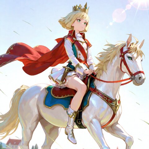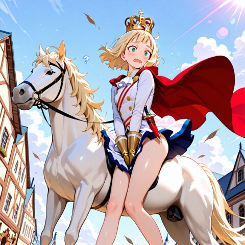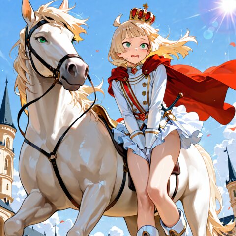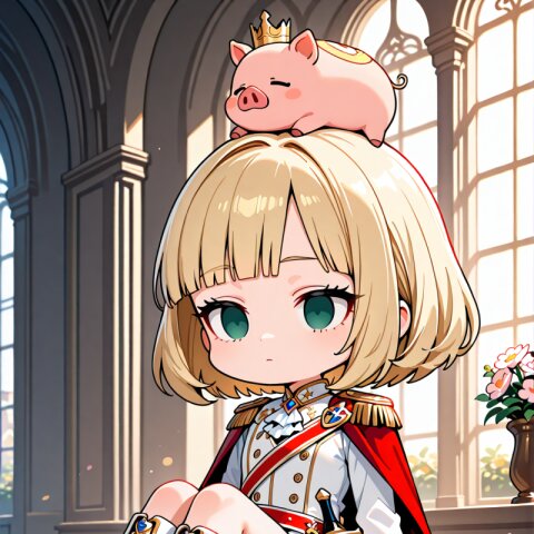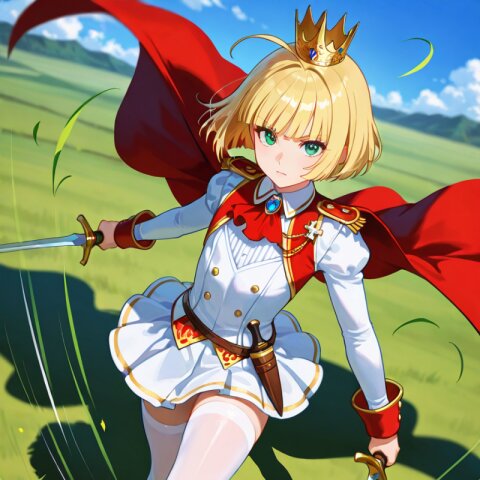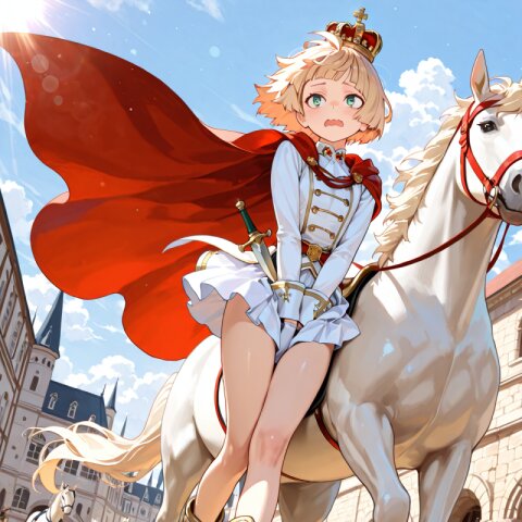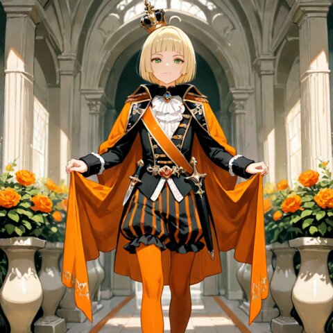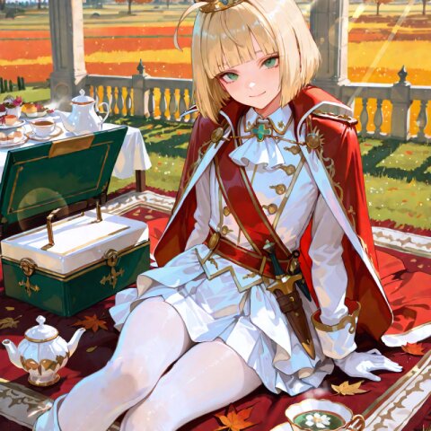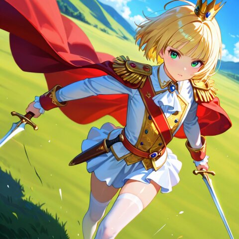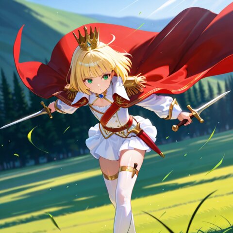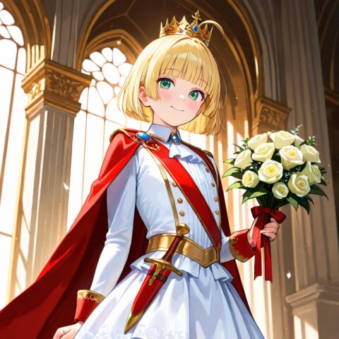 solo,1boy,ahoge,green eyes,blonde hair,blunt bangs,straight hair,short hair,hime cut,delicate face,detailed face,detailed skin,detailed hair,masterpiece,best quality,insanely detailed,beautiful,16k,prince charming,(White prince costume:1.4),(red cape:1.2),long sleeves,flat chest,(dagger on waist:1.3),(crown:1.2),mini skirt,whiite tights
