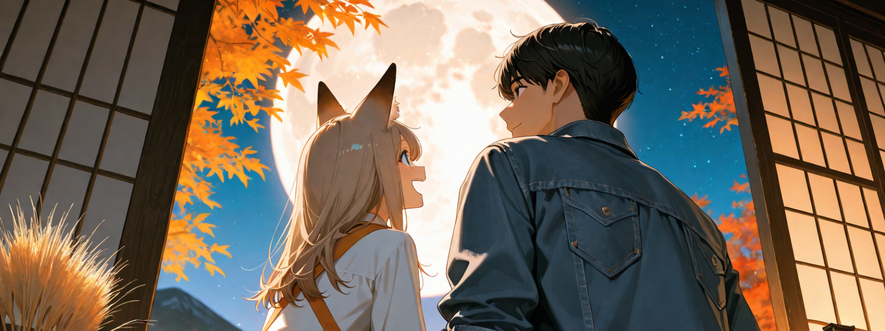 light brown hair, Waist-length long hair, choppy bangs, blue eyes, (light brown fox ears, Light brown fox tail with white tip, petite), flat chest, happy laughing, white blouse, square neckline, front buttons, three-quarter sleeves, milk tea beige jumper skirt, cotton fabric, simple design, below-the-knee length, off-white stole, lightweight linen fabric, light brown short boots, lace-up, soft leather, small fabric shoulder bag, embroidered,