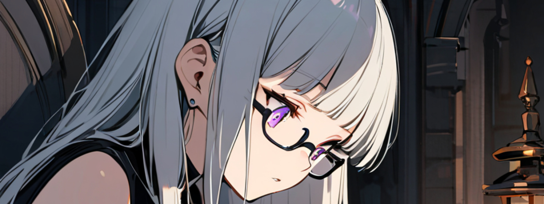 1girl, solo, 15years old, expressionless, long hair, white hair, purple eyes, ((sharp eyes)), blunt bangs, straight hair, earring, black choker, ((semi-rimless black-framed eyewear)), medium sleeveless, black dress, detached sleeves, parted lips, (looking down:1.4), reading books,