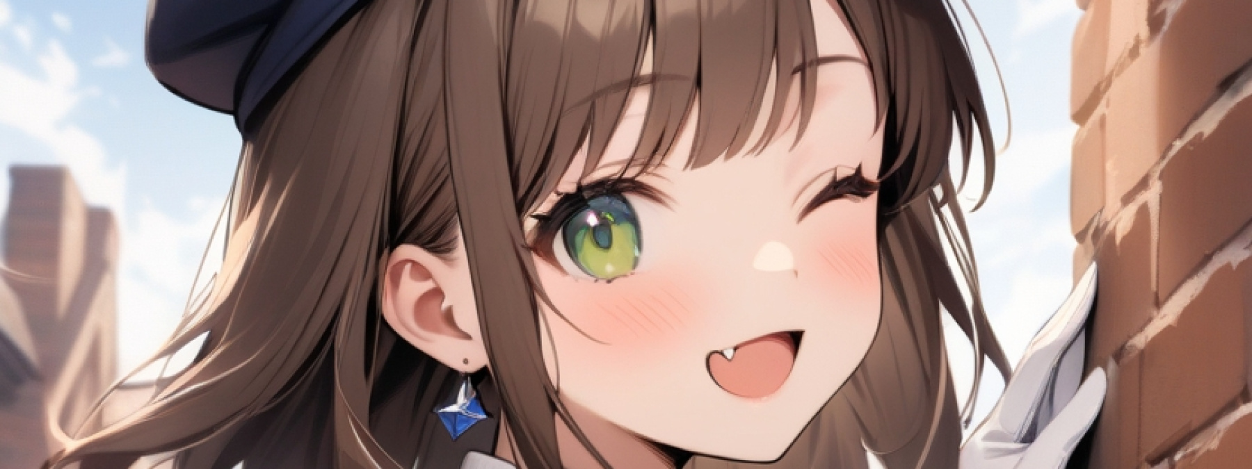 detailed, masterpiece, 1girl, solo, 15years old, medium hair, bangs, brown hair, green eyes, earrings, fang, (newsboy hat, dark blue headwear, White Pinstripe sweatshirt, long sleeves, blue overalls, brown loafer, white gloves), one eye closed, smile, open mouth, blush,
