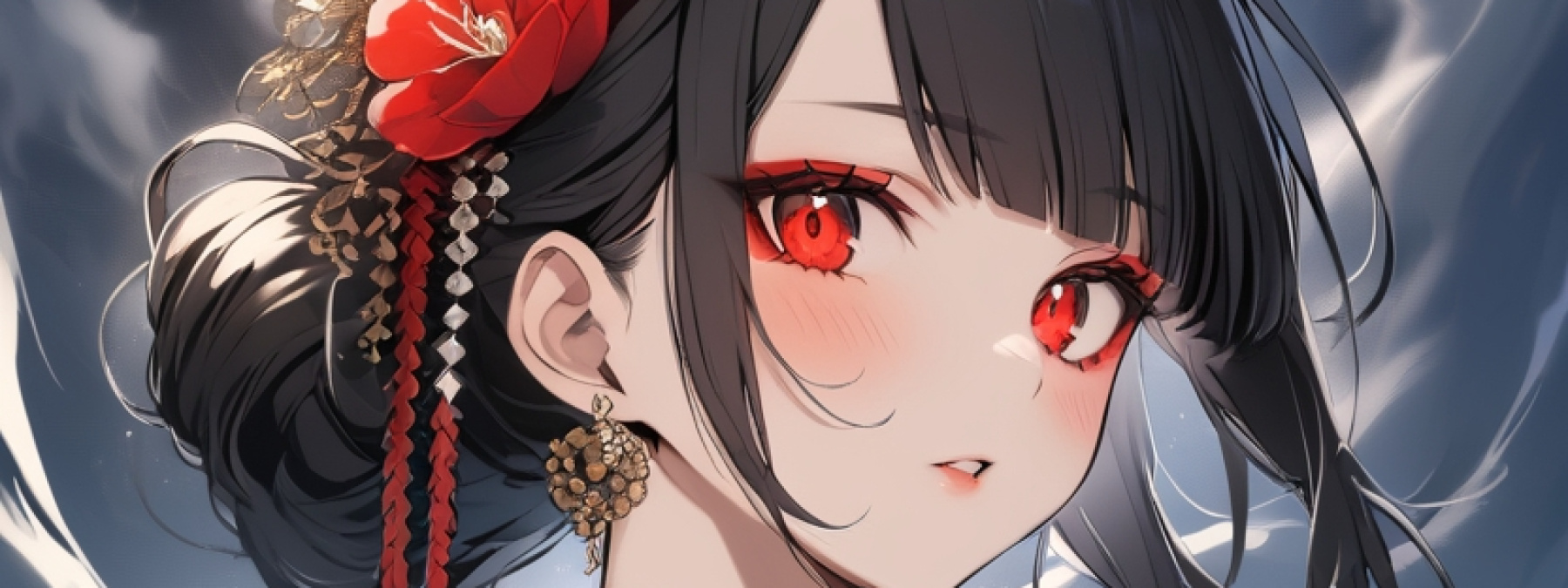 1girl, solo, 15years old, looking at viewer, updo, blunt bangs, black hair, hair ornament, red eyes, (sharp eyes), glowing eyes, jewelry, flower, earrings, hair flower, choker, long sleeves, japanese clothes, frilled dress, sash, obi, floral print, (black kimono), horns on head, makeup, lipstick, blush,