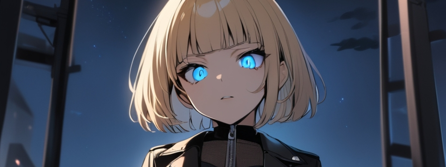 1girl, solo, 15years old, looking at viewer, unamused, bob cut, blunt bangs, blonde hair, blue eyes, (sharp eyes), glowing eyes, skirt, long sleeves, leather jacket, cropped jacket, black gloves, brown boots, zipper, fishnet pantyhose, black jacket, black colored shirt, black belt, black dress, navel, midriff, stomach, open clothes, open jacket, parted lips,