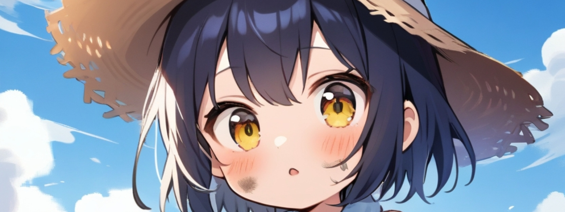 1girl, solo, 15years old, sidelocks, very short hair, yellow eyes, dark blue hair, white gloves, sun hat, straw hat, towel around neck, bare shoulders, collarbone, black tank top, khaki cargo pants, brown boots, parted lips, blush, ((sweating)), dirty clothes, dirty skin, dirty face,