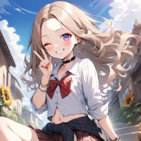 1girl, solo, 15years old, looking at viewer, light brown hair, long hair, forehead, parted bangs, wavy hair, purple eyes, grin, hoop earrings, choker, bracelet, thighs, bare legs, black socks, make up, lipstick, navel, midriff, stomach, clothes around waist, collarbone, sleeves rolled up, red bowtie, collared shirt, pleated skirt, plaid skirt, white lose socks, brown loafer, bracelet,