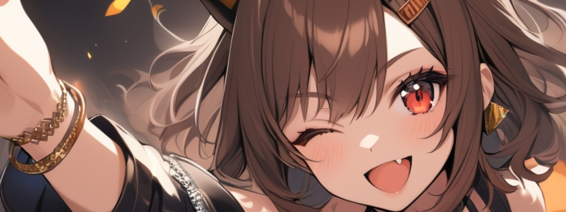 Highly detailed, 1girl, solo, 15years old, looking at viewer, medium hair, brown hair, deep red eyes, medium brests, jewelry, choker, tiger striped triangle bikini, tiger striped thigh boots, midriff, navel, thighs, horns on head, one eye closed, open mouth, smile, fang, collarbone, bracelet,