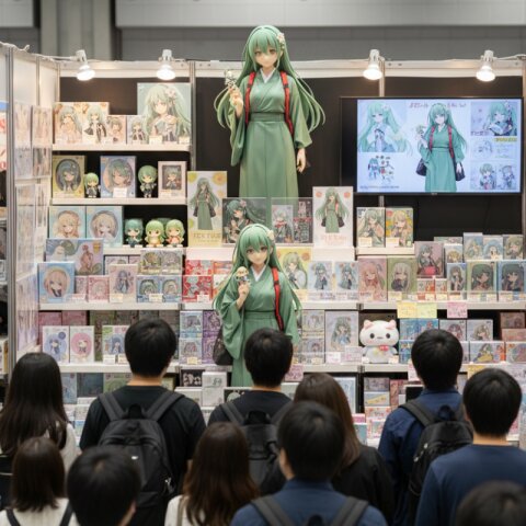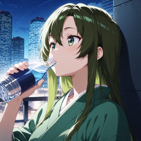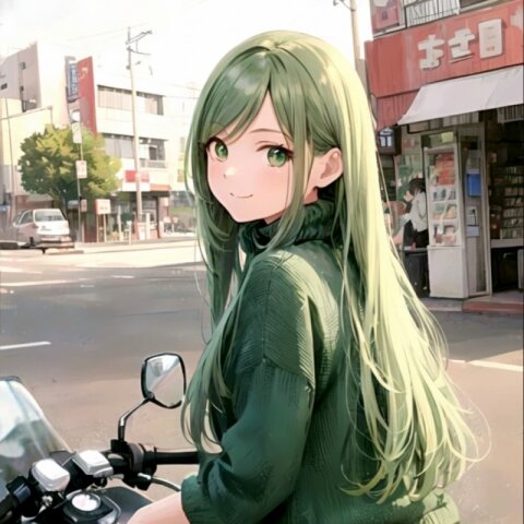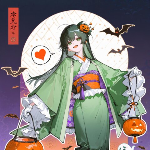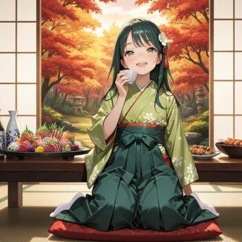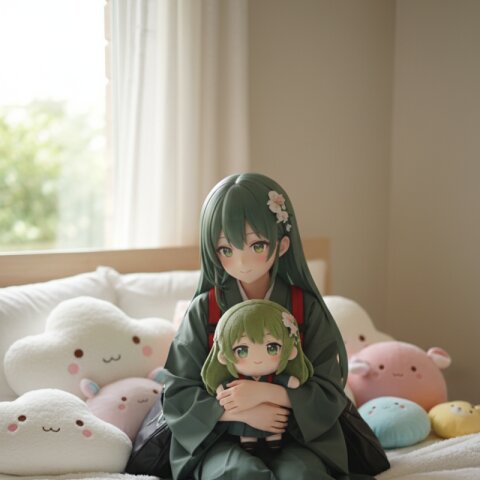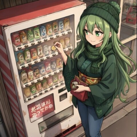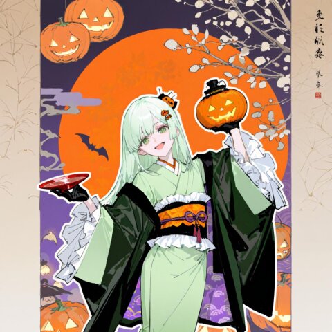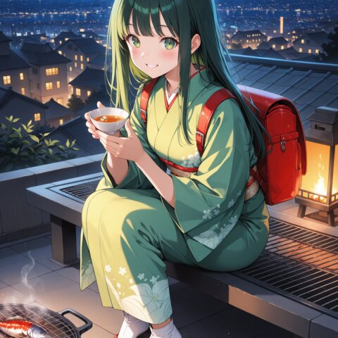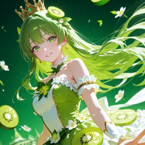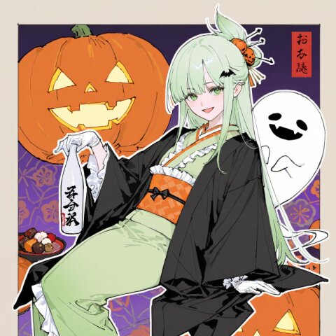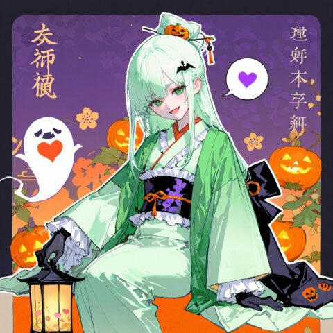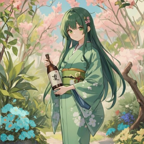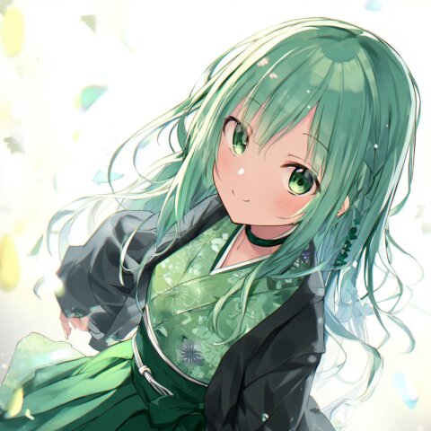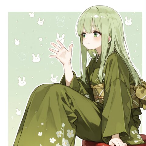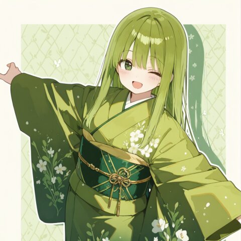 緑色の髪、緑色の目、ストレートへア、緑の着物、足袋、サンダル、
