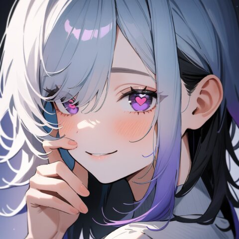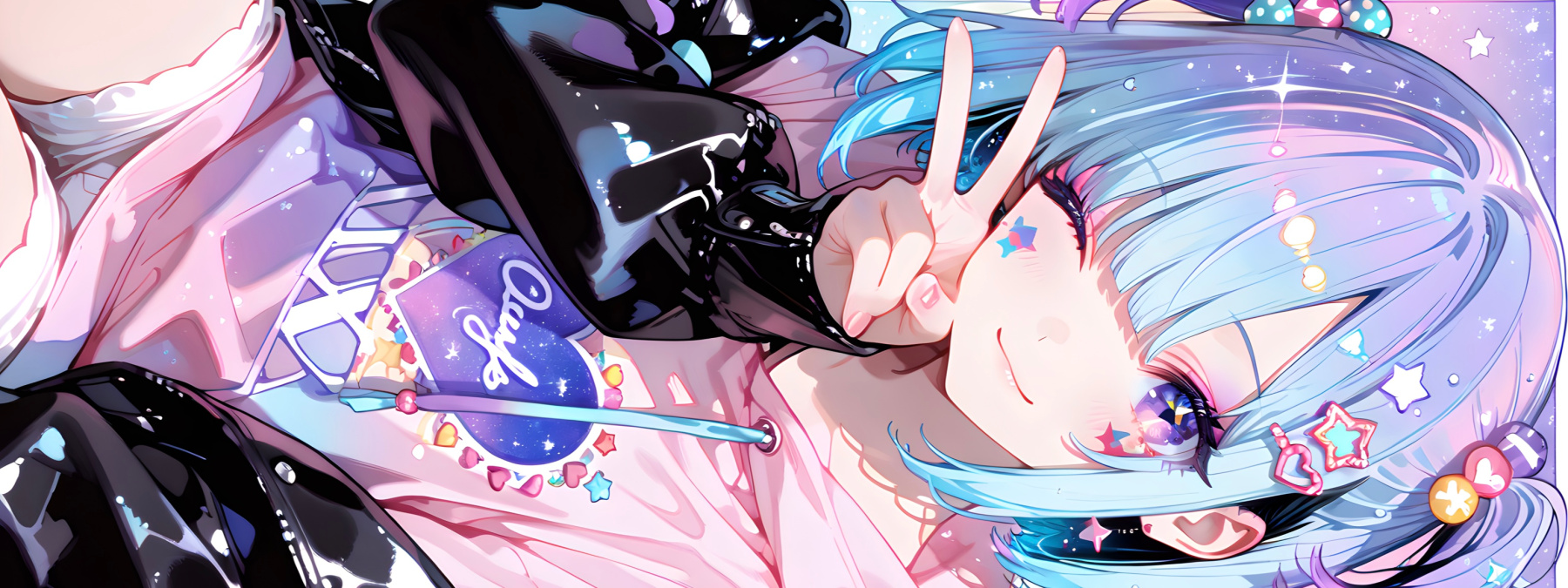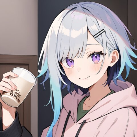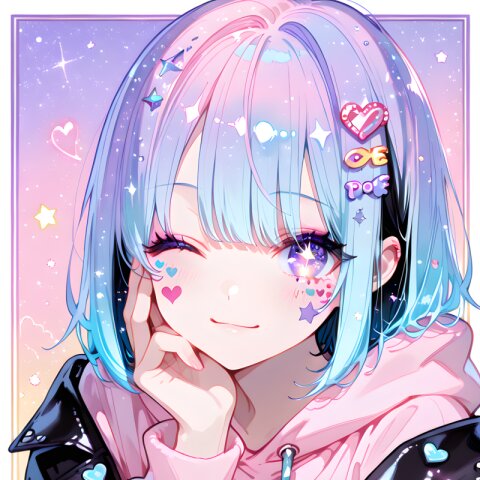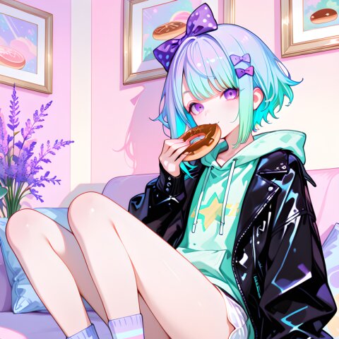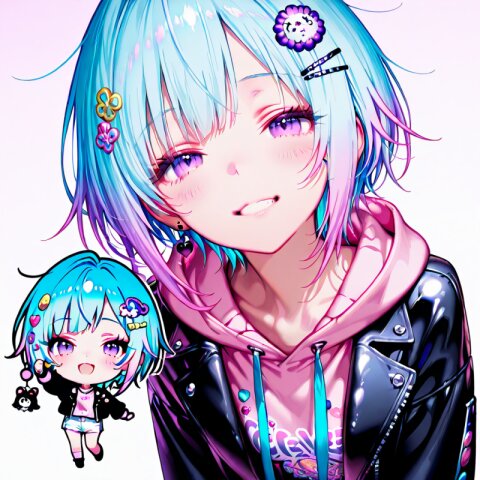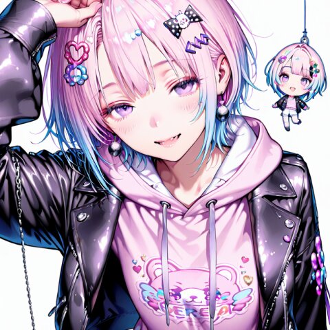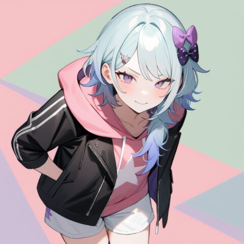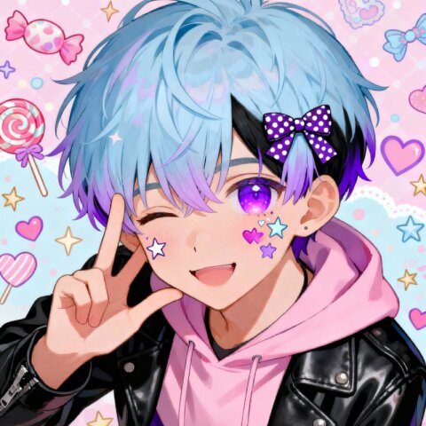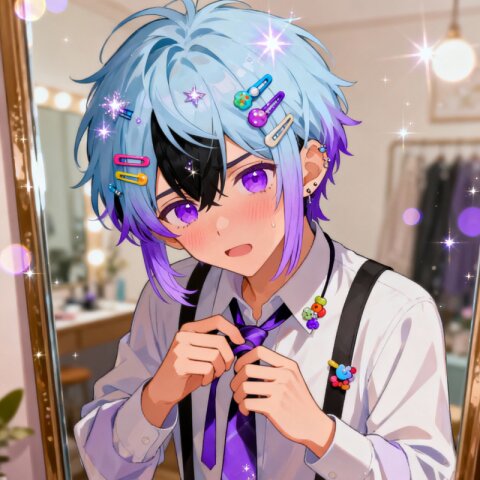 1boy, male focus, purple eyes, short messy layered hair, short hair, side bangs framing face, light blue hair with lavender gradient tips, black inner hair layers with purple shading, subtle highlights, polka dot ribbon-shaped hairpin, decora fashion, harajuku style, colorful accessories,