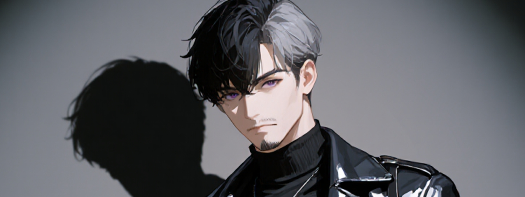 An illustration with a dark, sophisticated atmosphere. A late-thirties Asian man. His black hair is streaked with gray and trimmed into a short cut. He sports a thin goatee and mustache, with sharp eyes. His eyes are a deep purple, and his expression is calm. He wears a black turtleneck sweater layered under a glossy black leather trench coat, left wide open to emphasize his silhouette. A leather bag with metal buckles hangs diagonally across his chest. A silver cross pendant glints at his neck, adding a chic touch to the overall look.