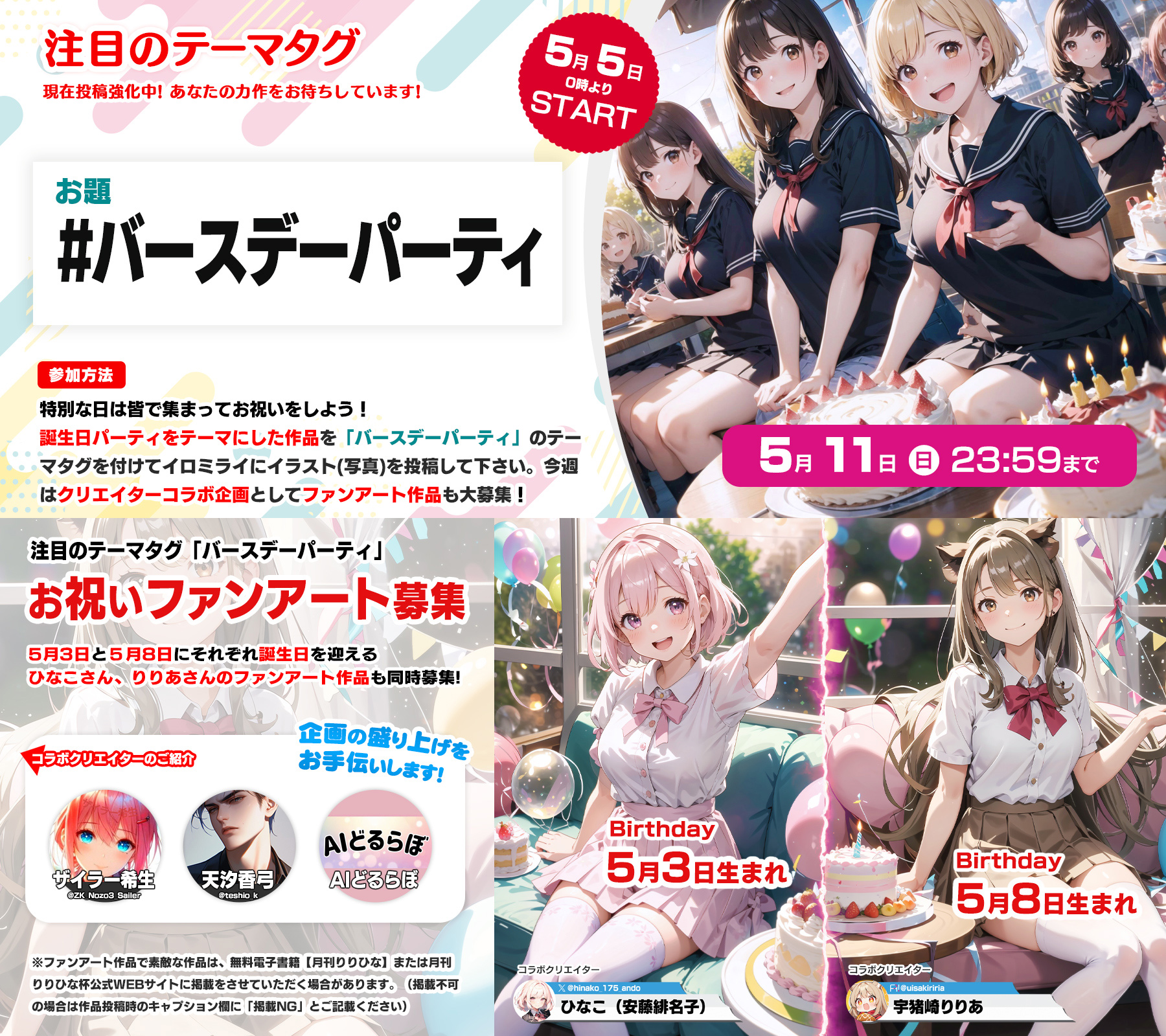注目のテーマタグ「バースデーパーティ」では、クリエイターコラボ企画として、同時期に誕生日を迎える「ひなこ(安藤緋名子)」(5月3日生まれ)、「宇猪崎りりあ」(5月8日生まれ) お二人のファンアート作品を大募集いたします!AIキャラクターたちの誕生日をファンアートで盛り上げよう!🥰