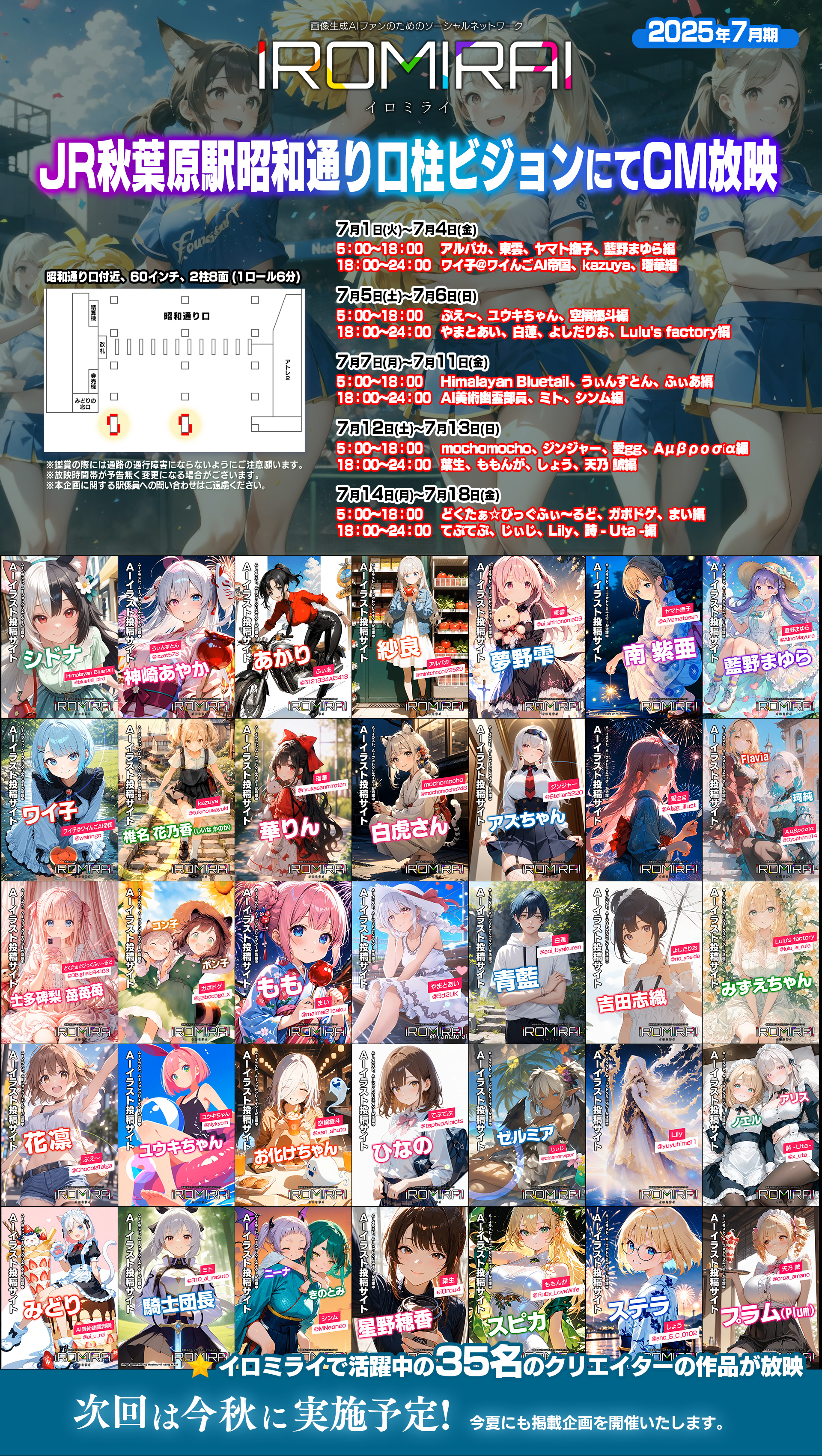 本日7月1日より、JR秋葉原駅昭和通り口の柱ビジョンにてイロミライのCMが放映されます!放映期間は7月1日(火)~7月18日(金)(2025年7月1日)