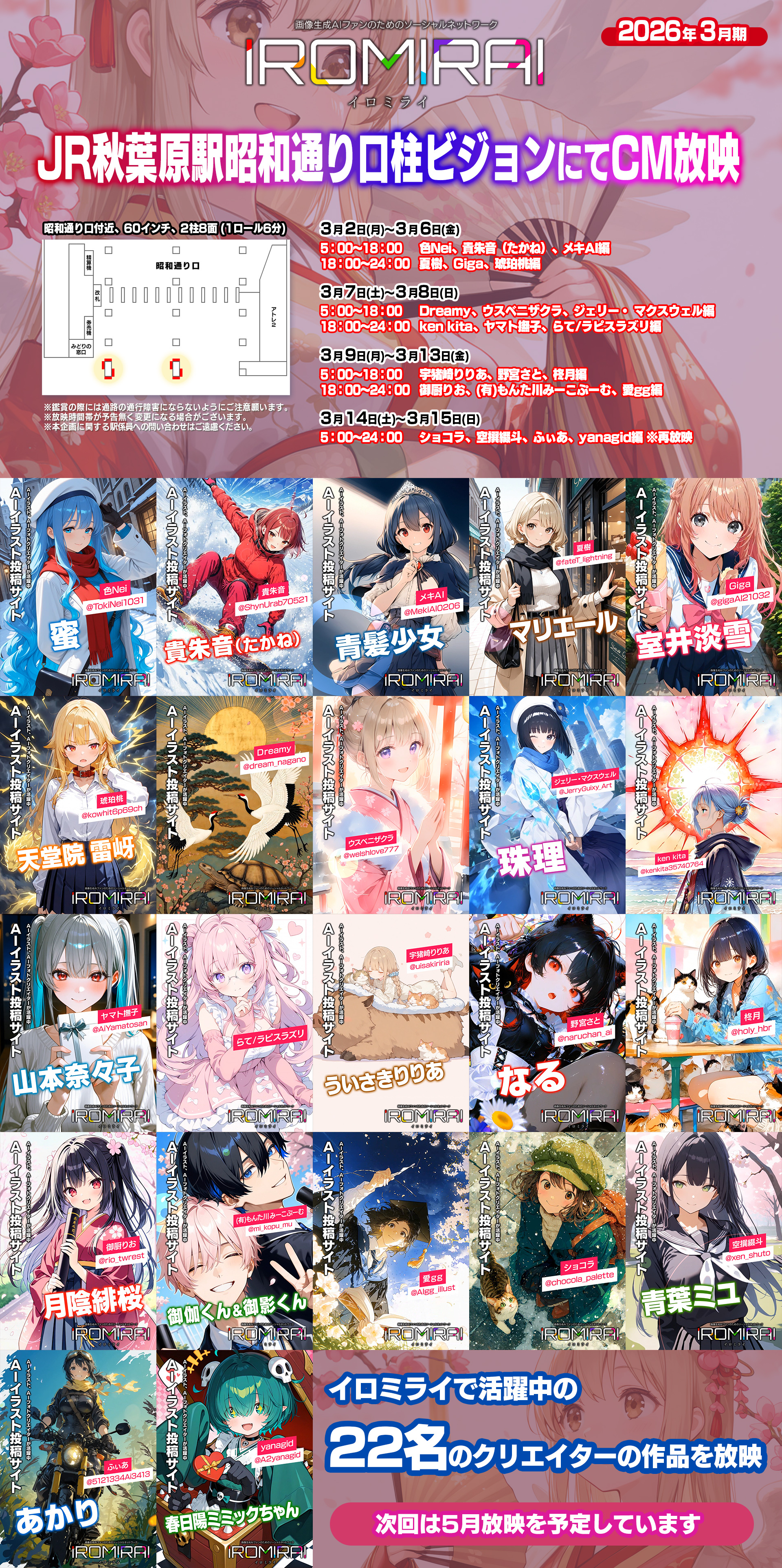 3月2日より、JR秋葉原駅昭和通り口の柱ビジョンにてイロミライのCMが放映されます!放映期間は3月2日(月)~3月15日(日)(2026年3月1日)