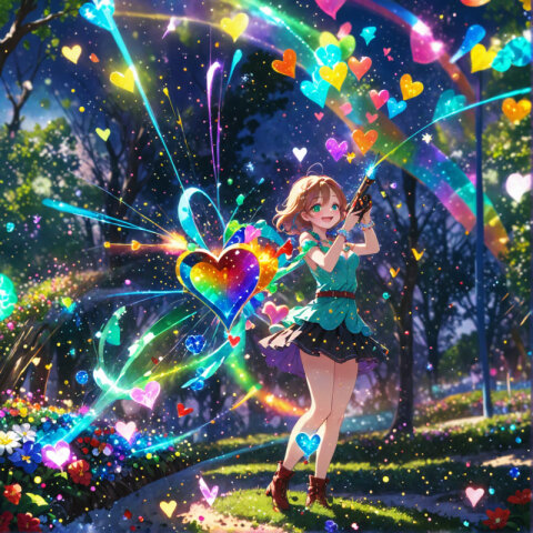 masterpiece, best quality, animation style, anime colored, illustration, middle breasts, magic particles, rainbow, in heat, happy, smile, look at viewer, 2 ladys, \deep blue\ mini dress, mini skirt, beautiful legs, white ruffle short socks, Pansies are blooming beautifully, colorful
