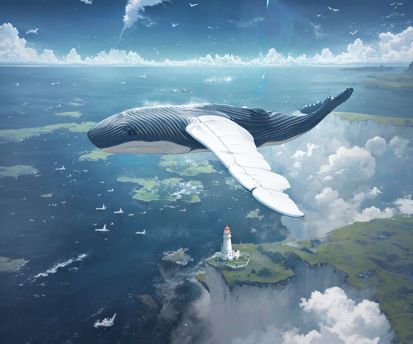 insanely detailed, masterpiece, very high resolution, large filesize, ((soft color)), (safe), (fantasying), (((1flying whale with wings in the sky))), light particles, ((islands and sea)), ((((lighthouse))))