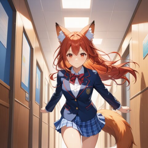 1girl,solo,((chibi character style)), kawaii, charm,adorable, red eyes,head ornament, pink hairpin, ahoge,1large fox tail, fluffy fox ears,long light brown hair, Fang,double eyelids,long eyelashes,full body shot, Guitar, microphone stand