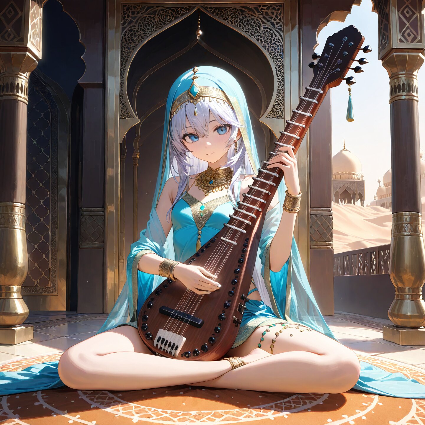 insanely detailed, masterpiece, very high resolution, large filesize, full color, (safe), 1girl playing sitar, (satisfying), (slender), cross-legged on floor, Arabian